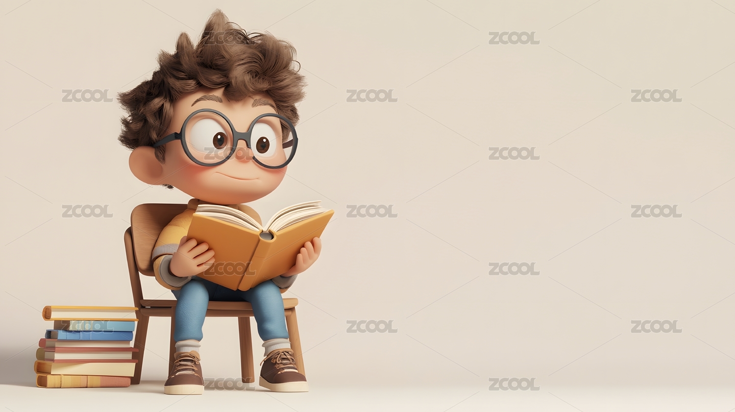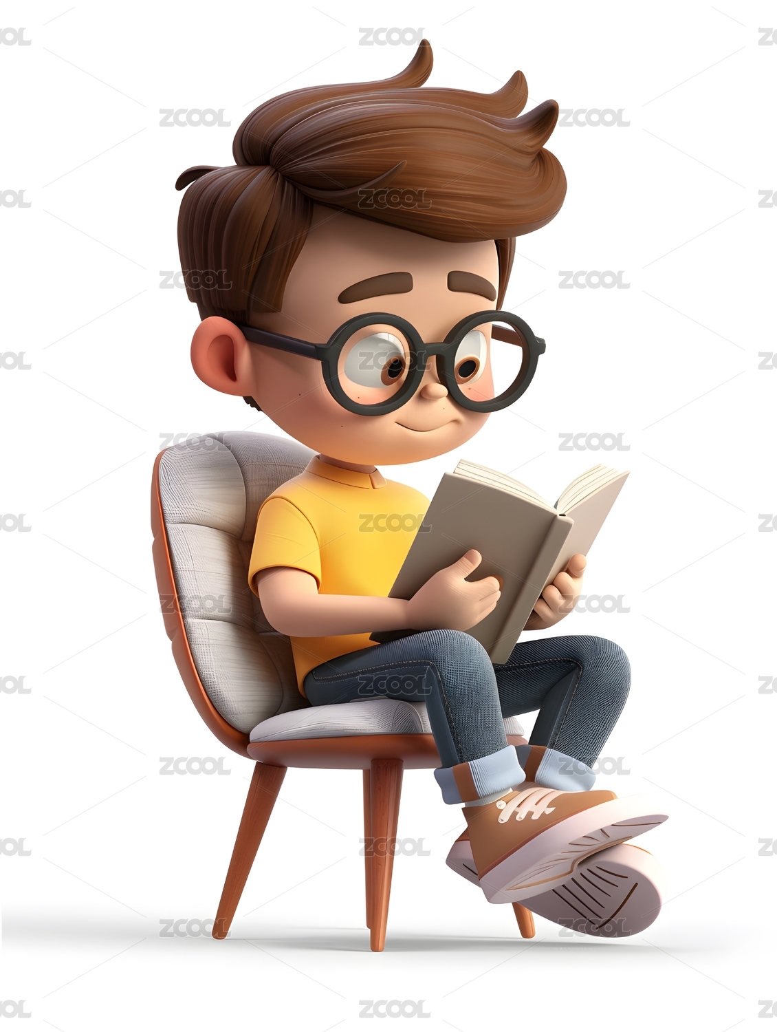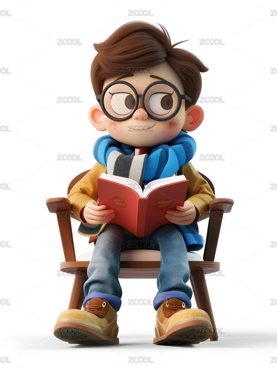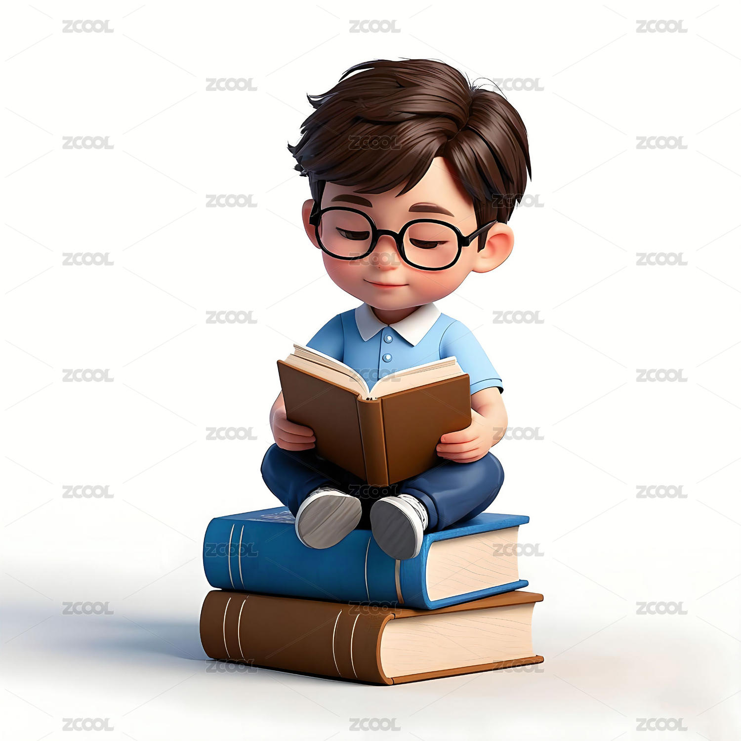 白底3D卡通风格坐在书本上微笑看书的儿童