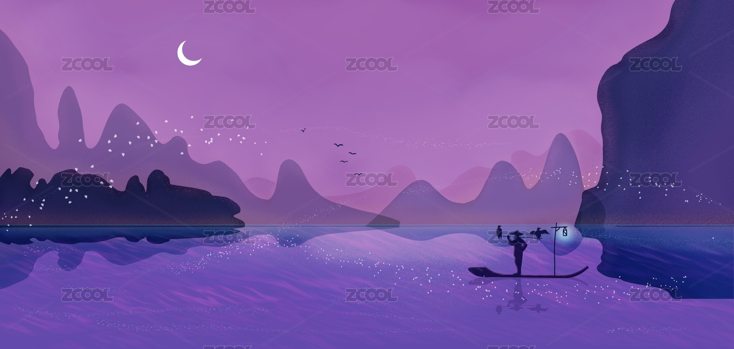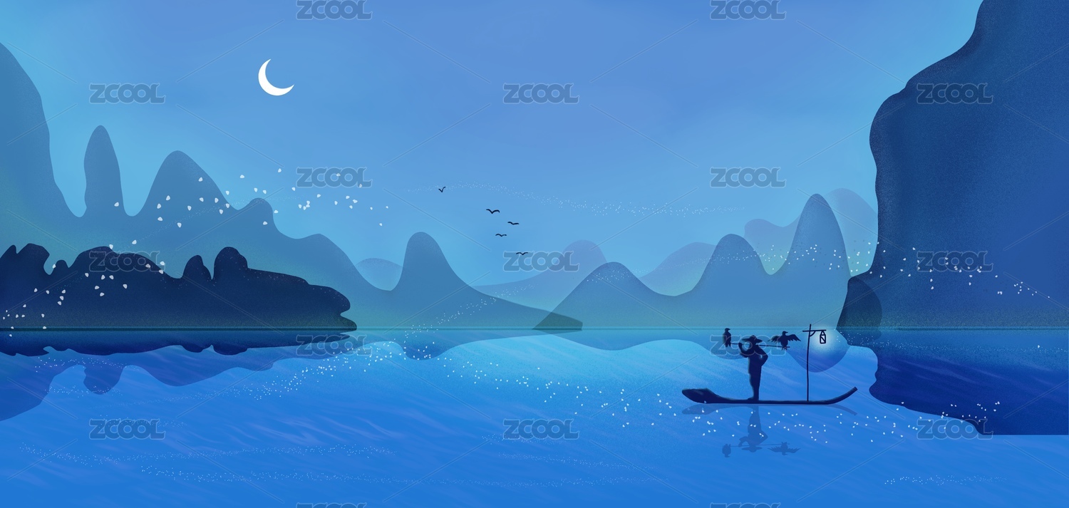 国潮中国风湖面上渔夫远山山水水墨风景插画