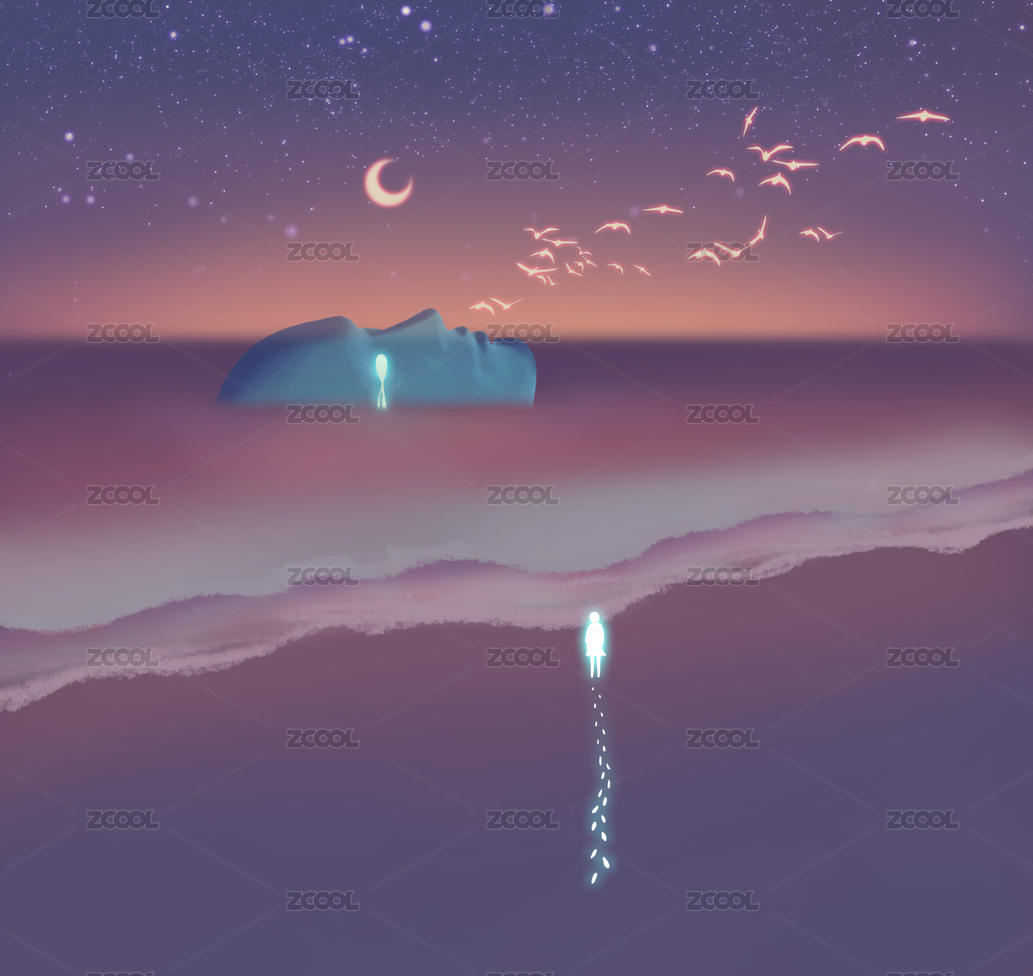 一个发光小人缓缓走向一个搁浅在沙滩的巨人