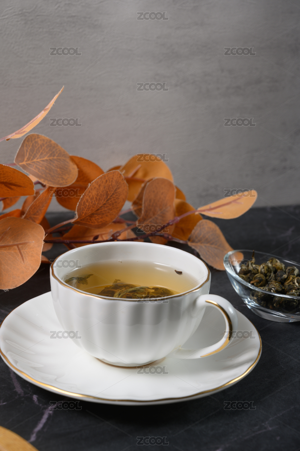桌面上的杯子里的甘甜可口的茉莉吐珠茶