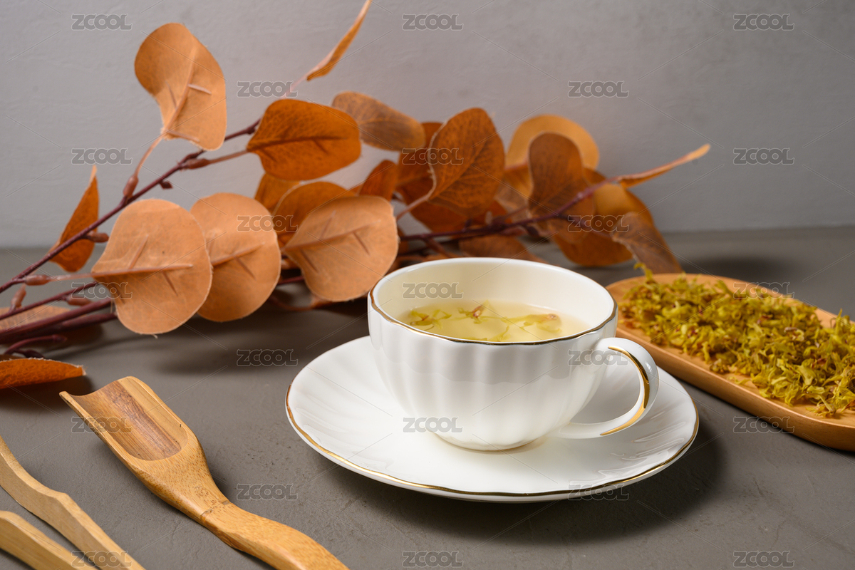 桌面上的杯子里的干爽清香的玳玳花茶