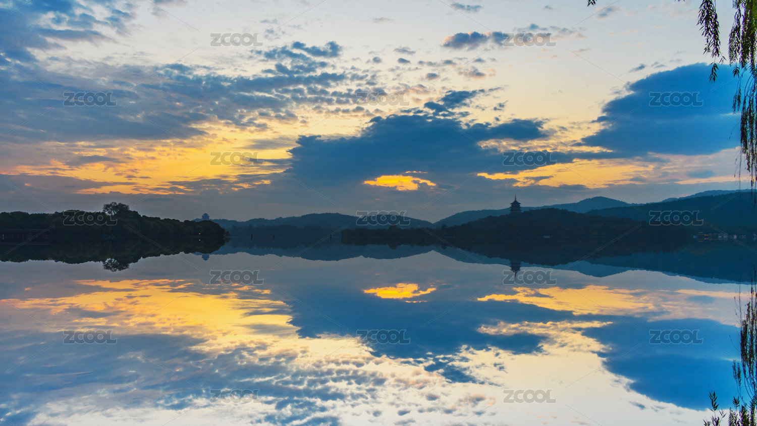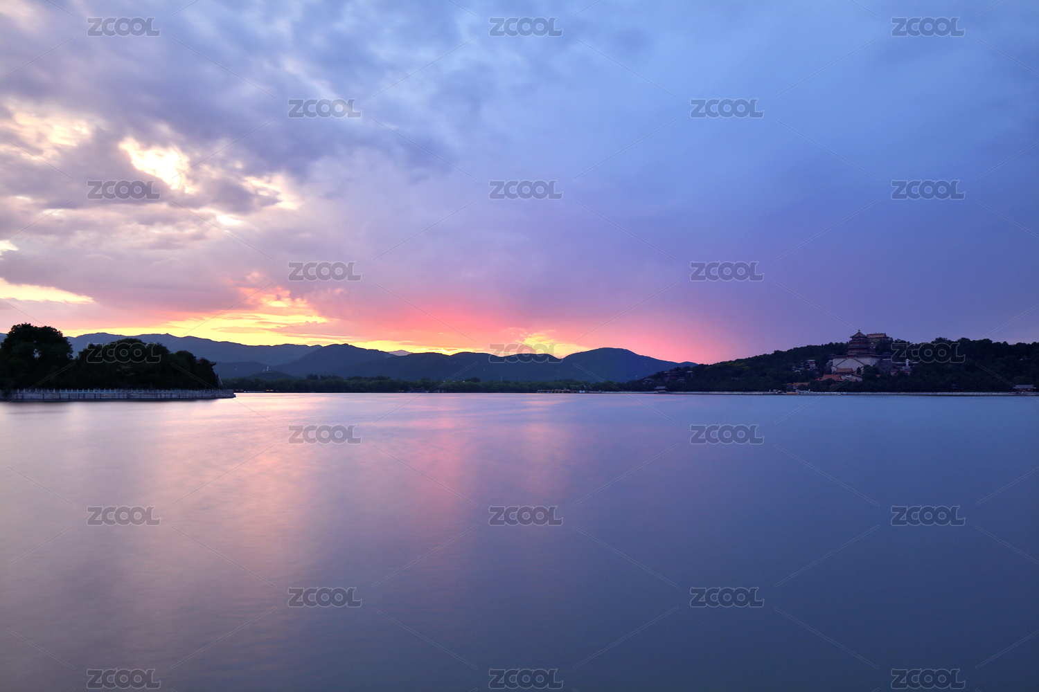 夕阳下的中国北京颐和园的湖泊园林建筑