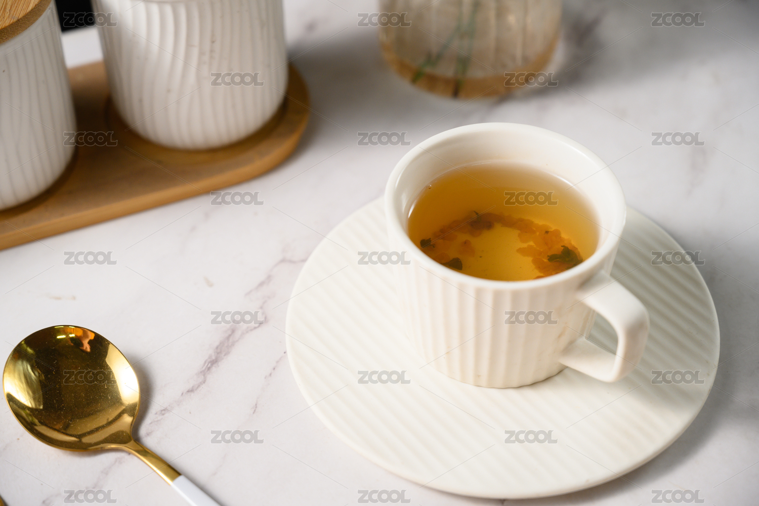 桌面上的杯子里的甘甜可口的夜交藤茶