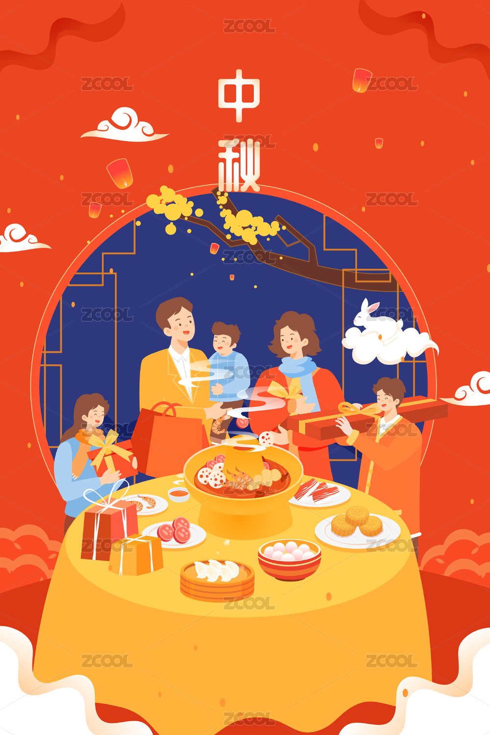 中秋节一家人团聚吃团圆饭海报传统节日插画
