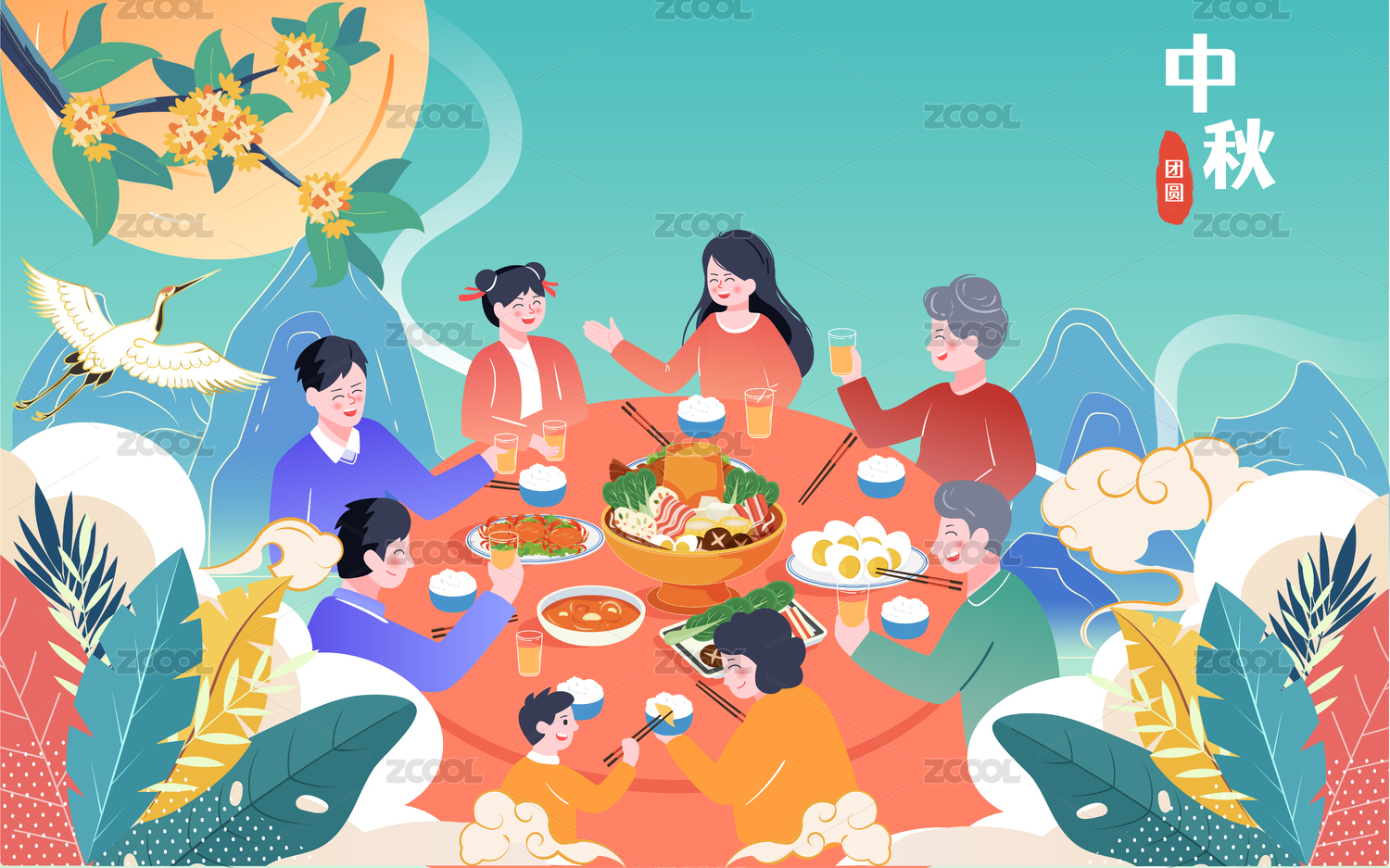 中秋节一家人吃火锅圆桌团圆饭美食插画