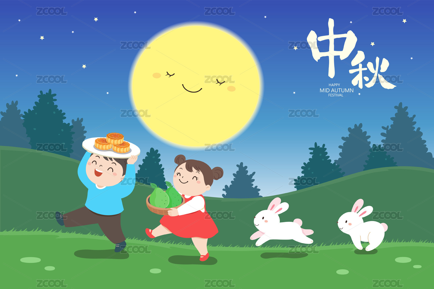 夜空有满月孩子和兔子排队向前走