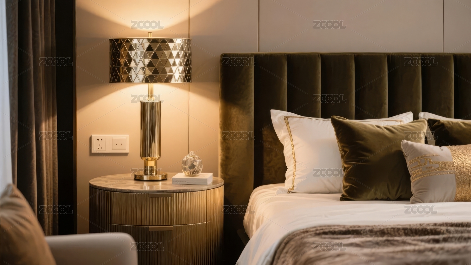 室内放有多个枕头的床上一角及床头柜上的台灯