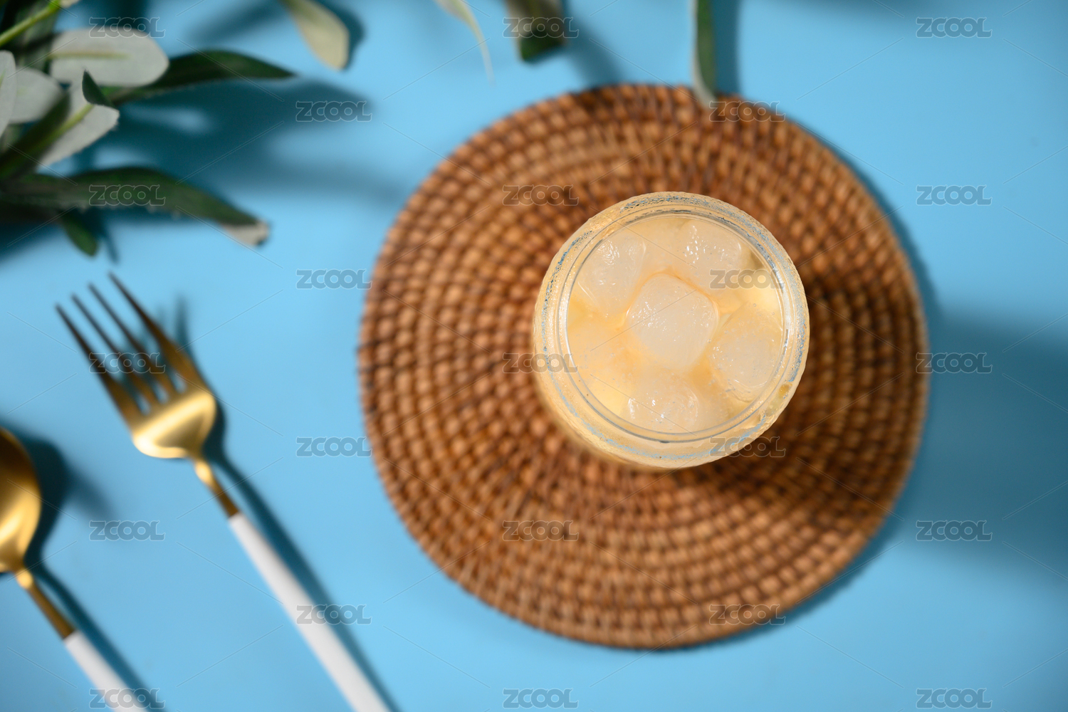 桌面上的杯子里的甘甜可口的冰茉莉花茶