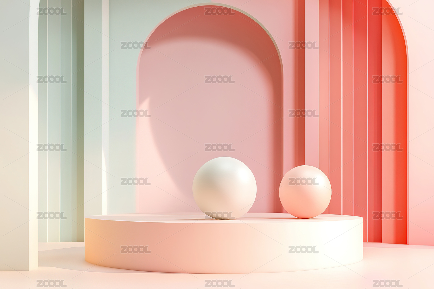 几何形状,3D渲染,光影效果,空间感,柔和色彩,极简主义,现代艺术,创意设计,抽象场景,白色圆柱
