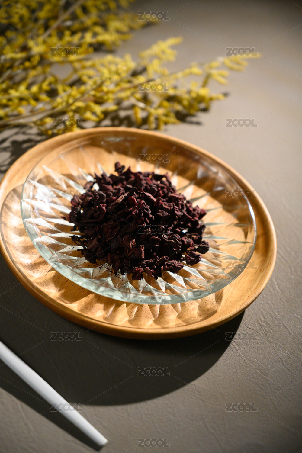 桌面上的盘子里的美味可口的龙血果干