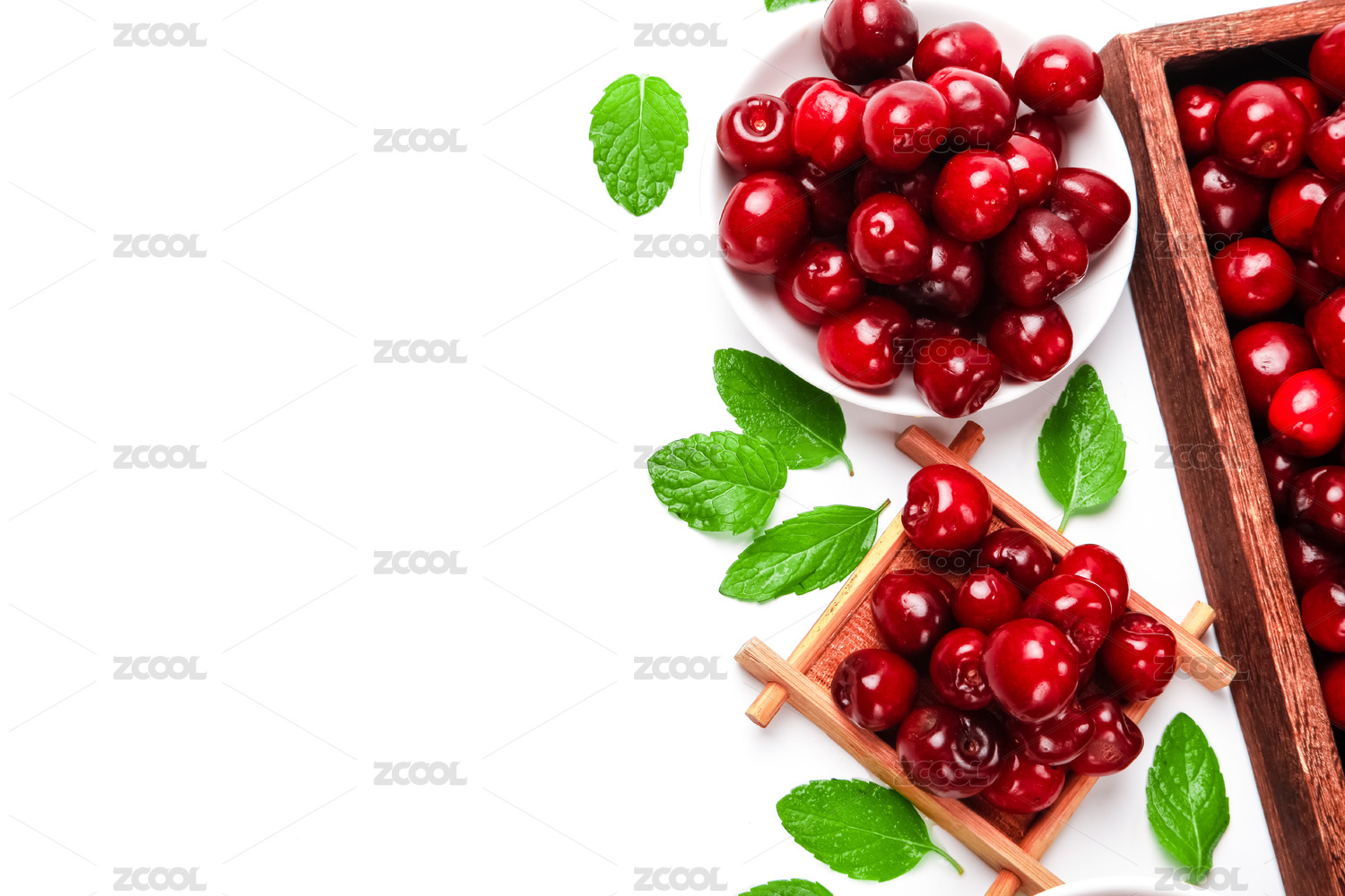 白底上装在木框和小白盘里的樱桃