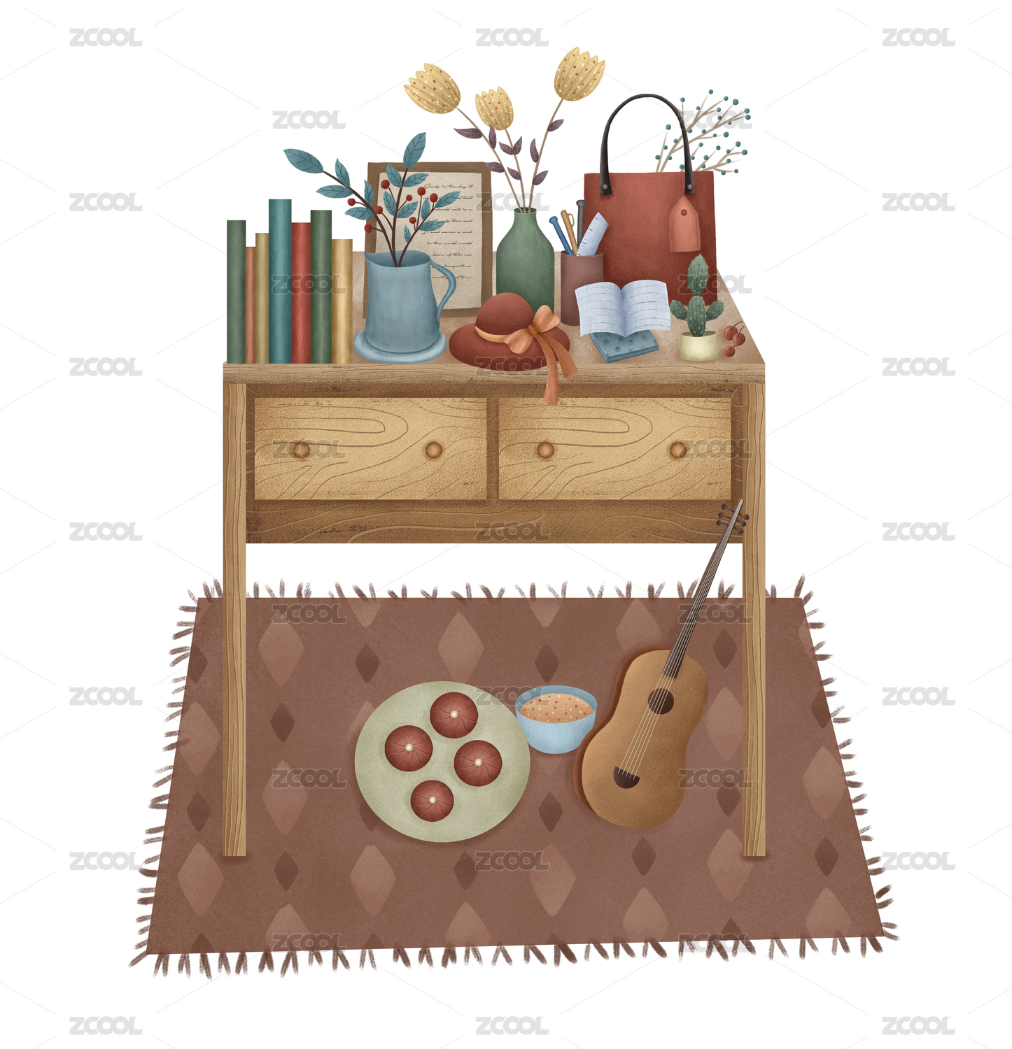 桌子包包书花瓶仙人掌吉他粥饼干静物场景