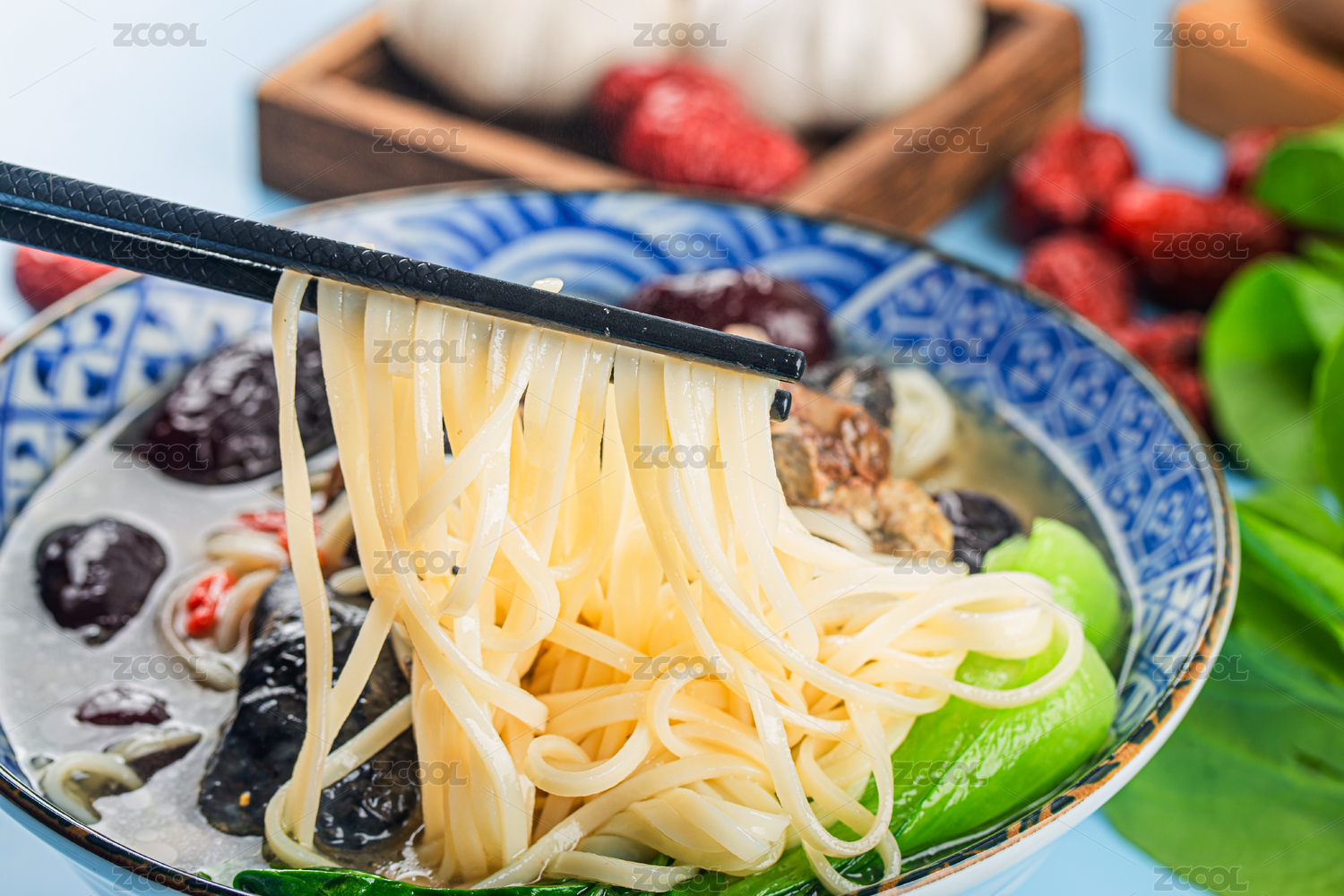竹底上放着一碗牛肉汤面和筷子上叉着面条