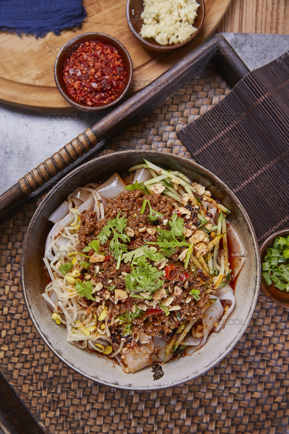 放在竹帘餐布上的一碗陕西传统家常拌面 — 陕西油泼面