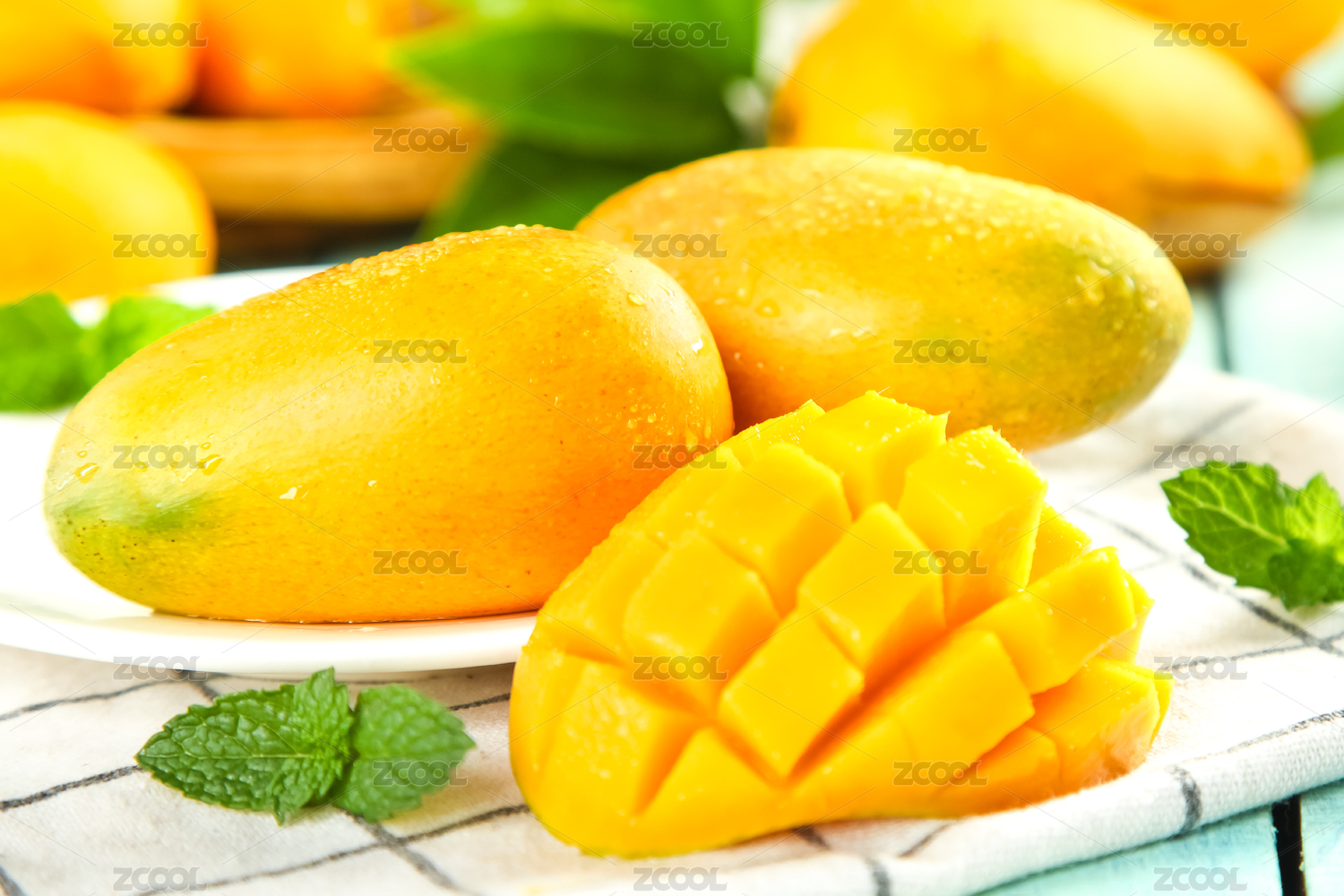 清新背景上放着一堆贵妃芒果和贵妃芒果肉