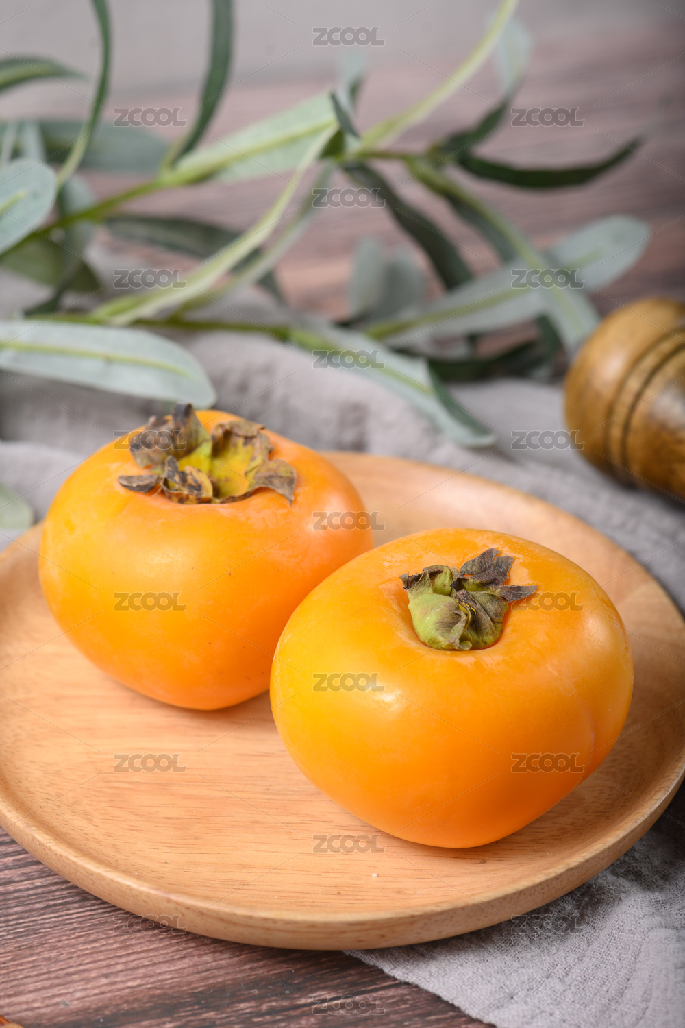 清新背景上放着一堆瑶乡脆柿和脆柿切面