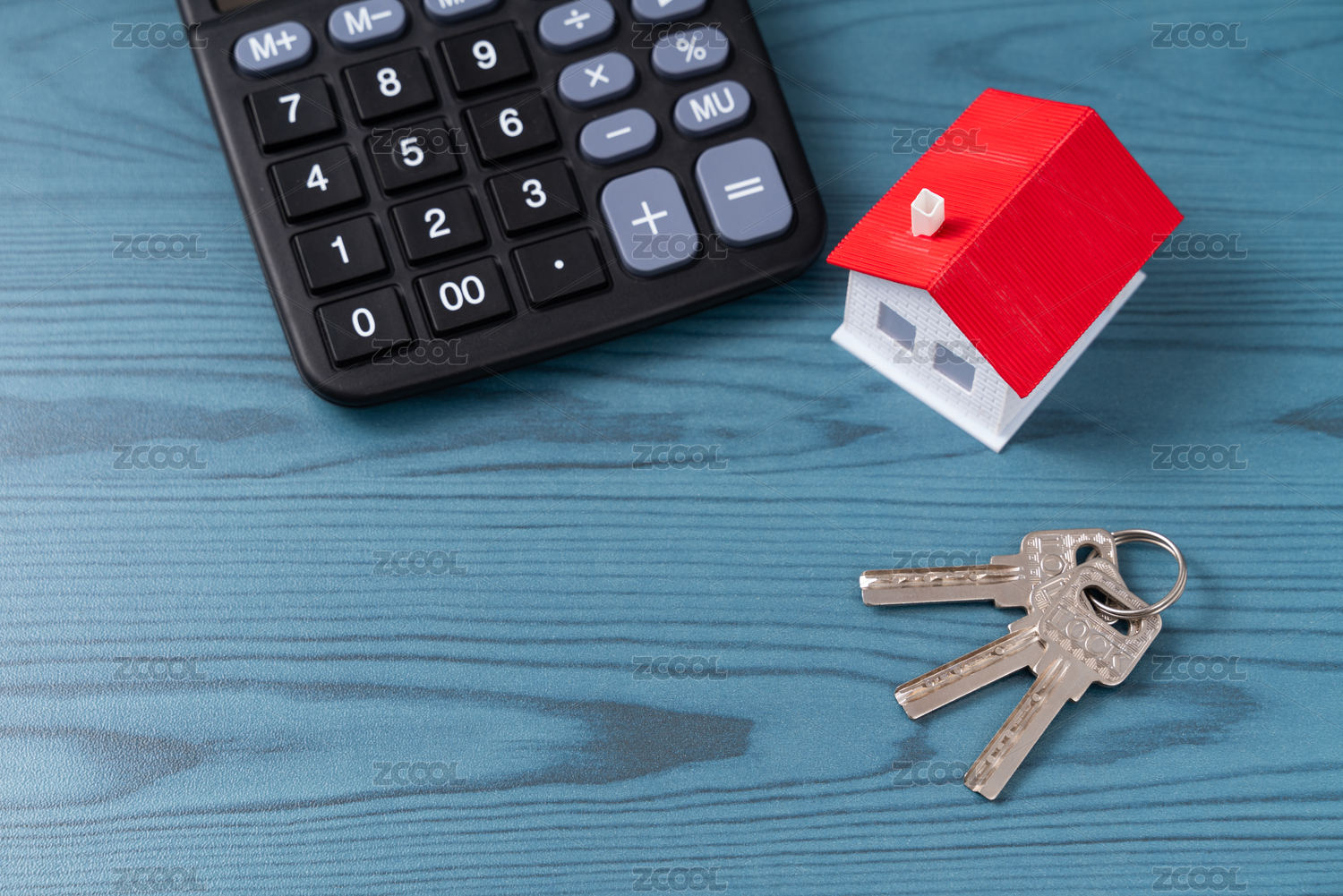房屋模型和钥匙,蓝色木纹桌面背景