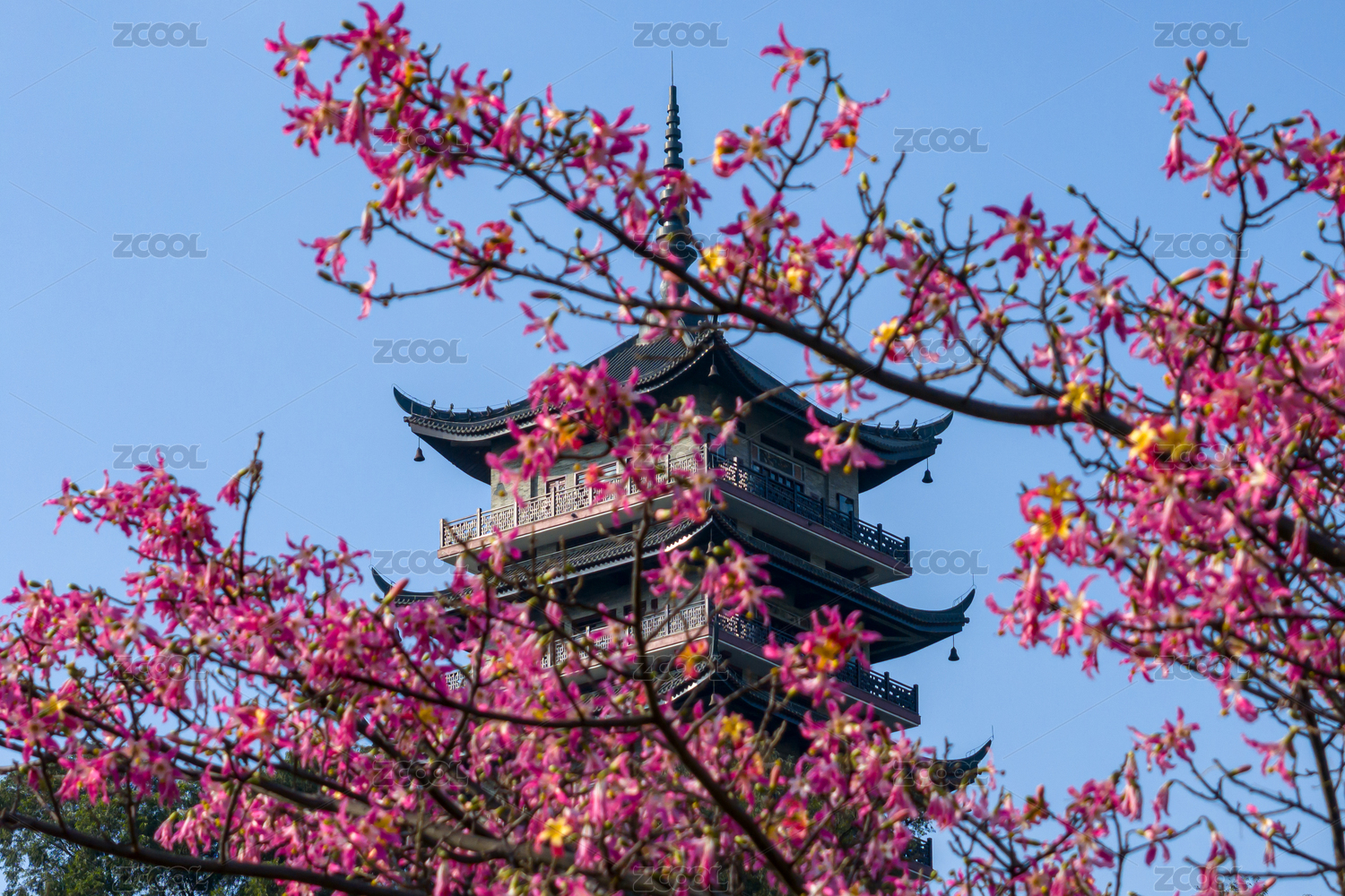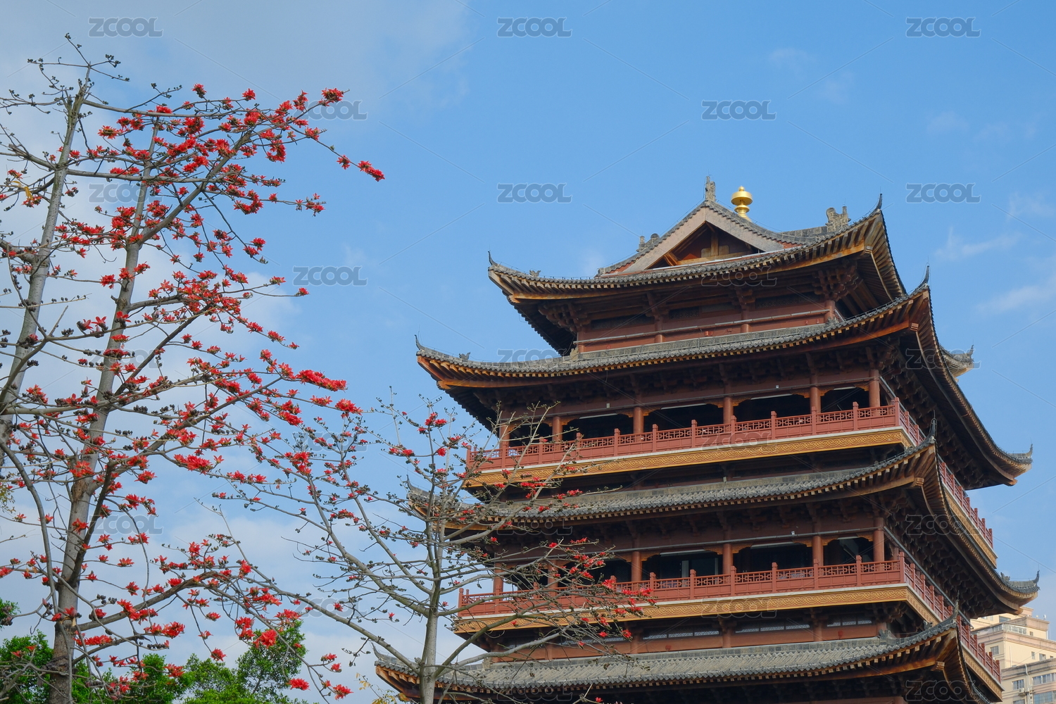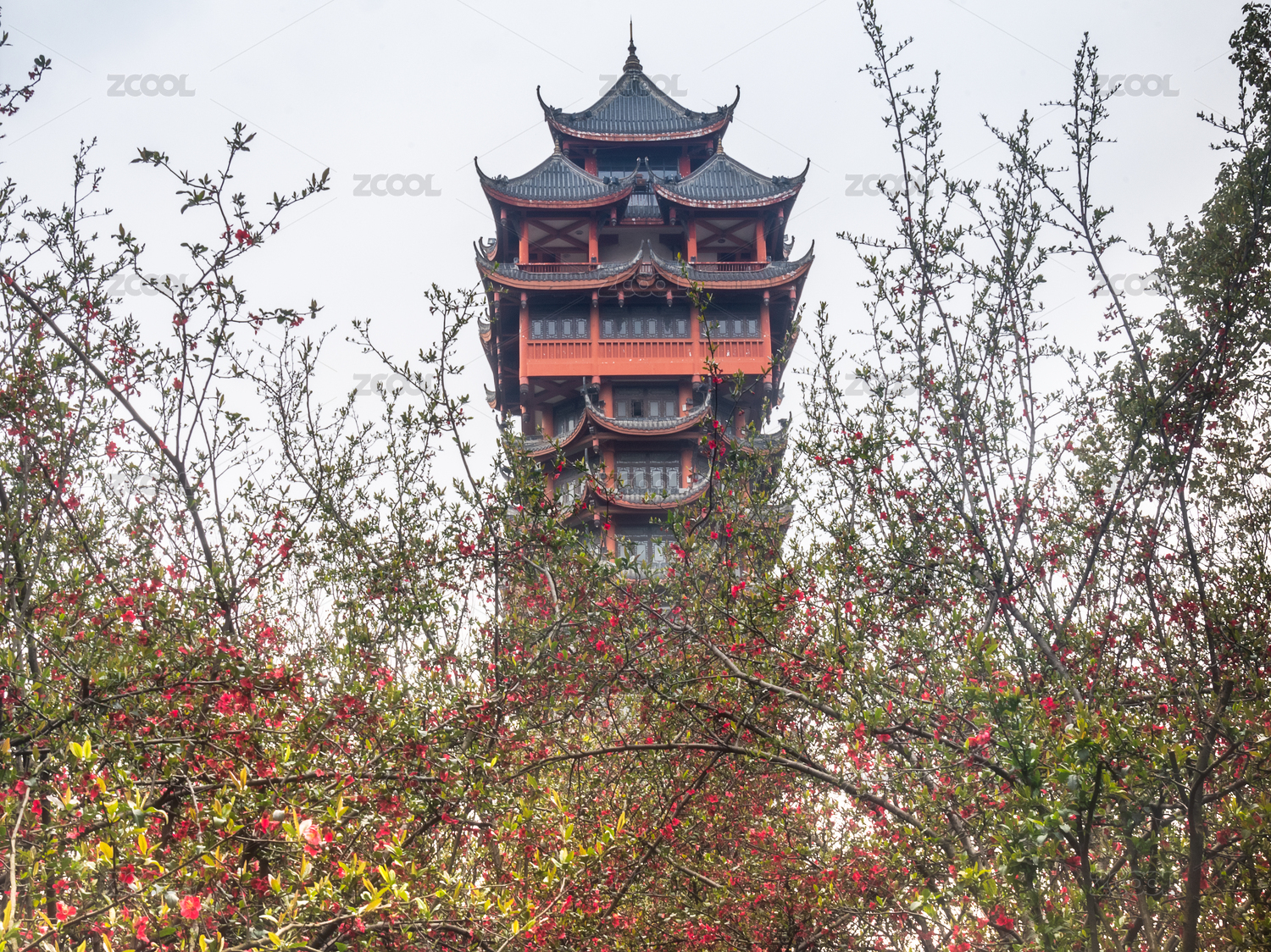 红色花朵后面一座古塔