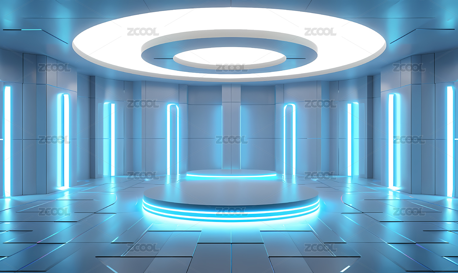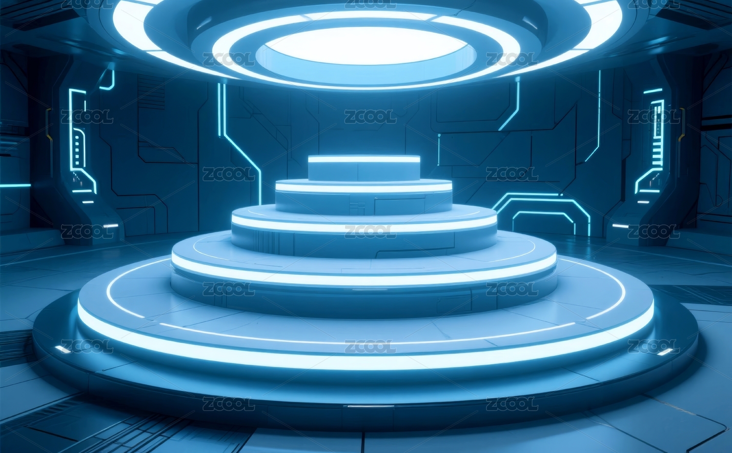 蓝色霓虹环绕圆形平台