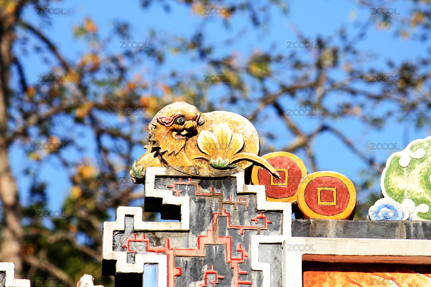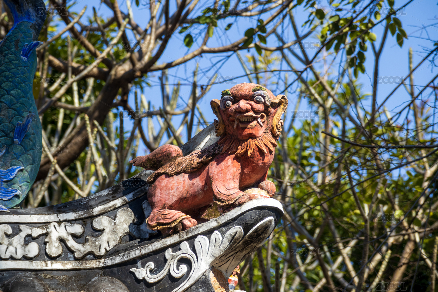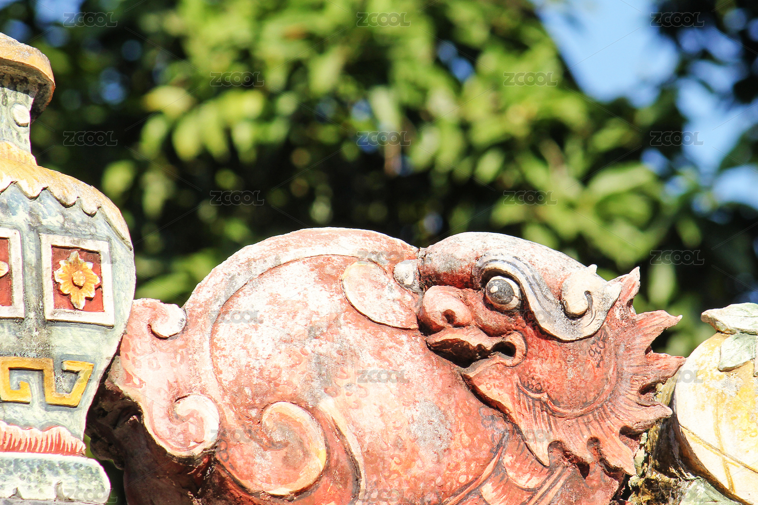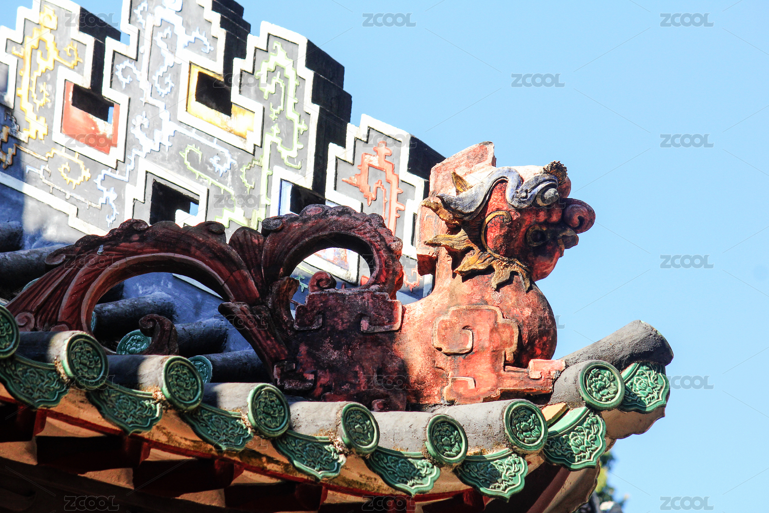 广东佛山祖庙传统建筑屋檐上雕刻的屋脊兽