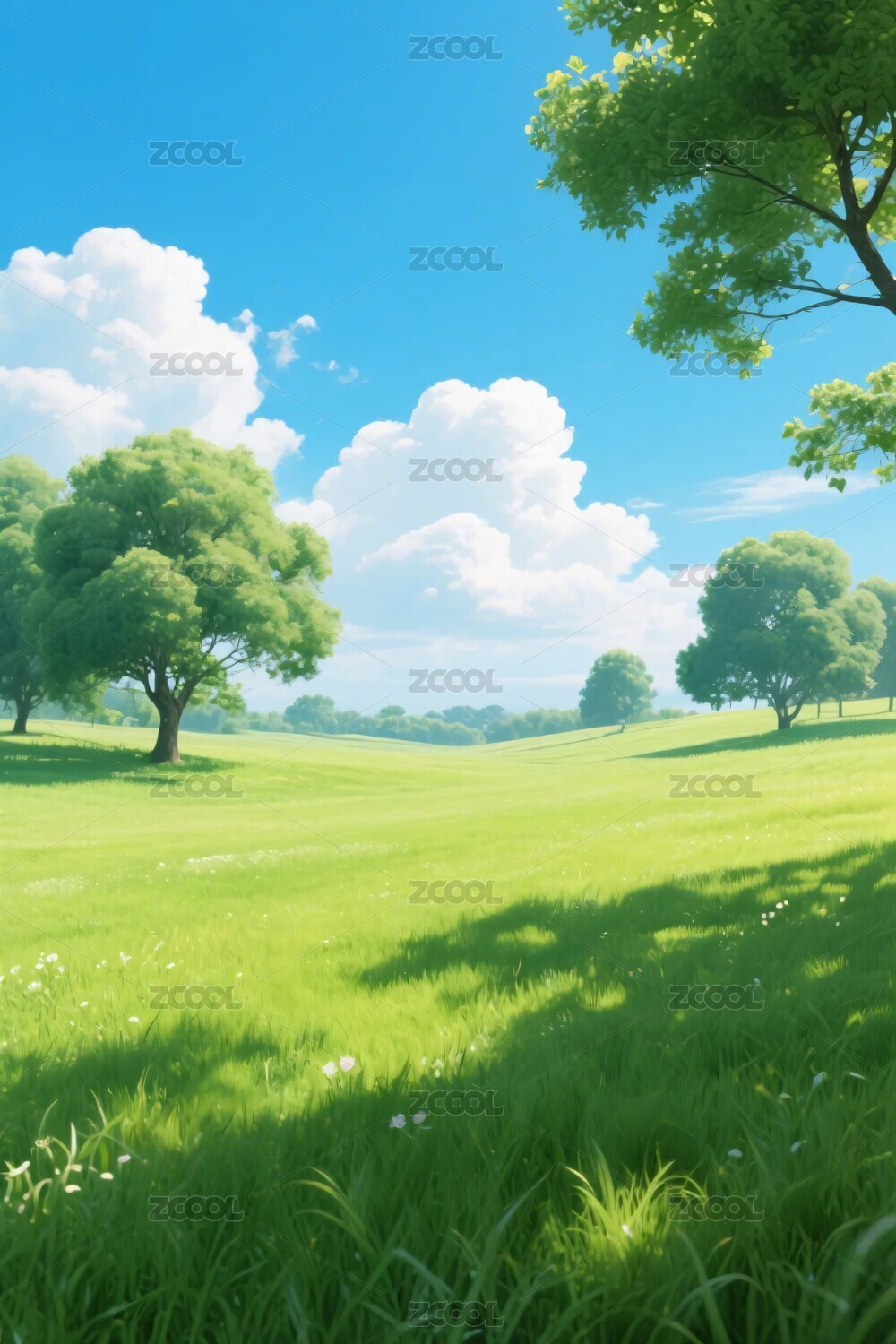 晴朗的天空,草地上一群小动物在愉快的玩耍