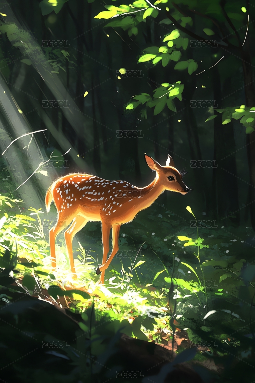 春夏季节绿树与草丛背景下阳光照在一支鹿和蝴蝶上的插画