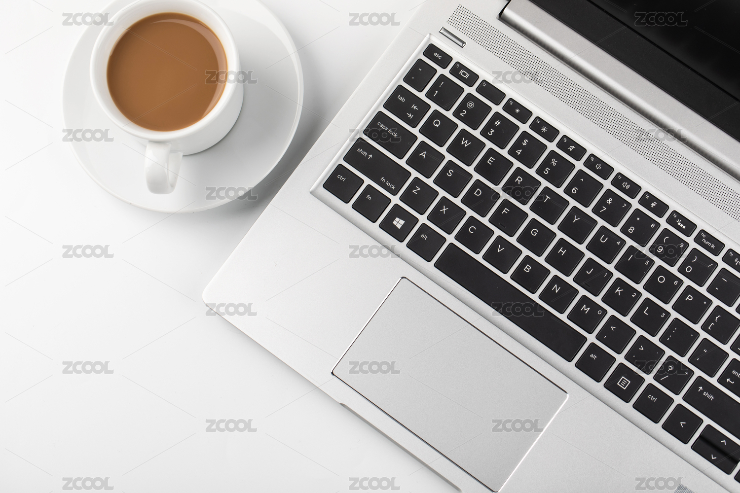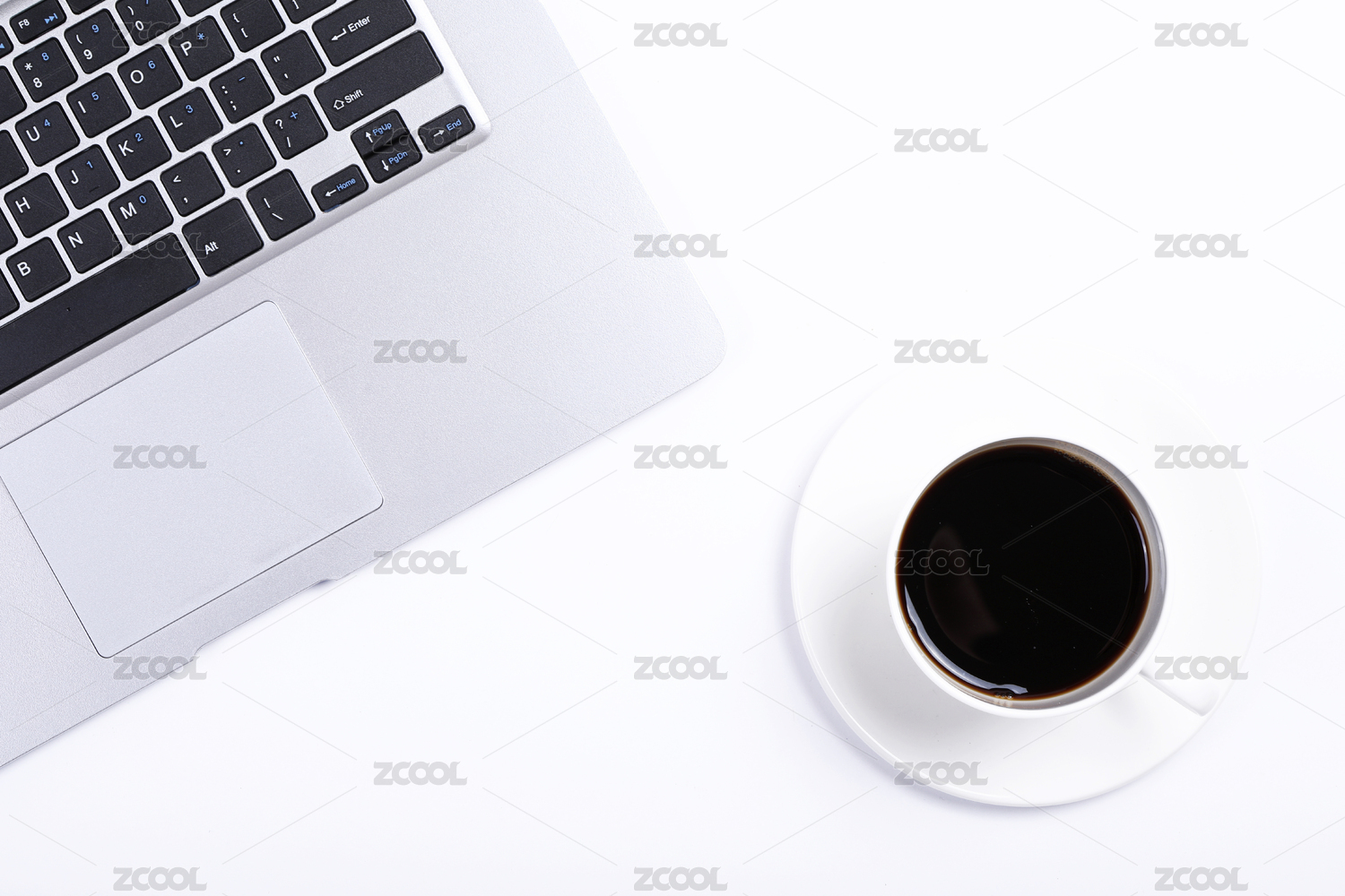 办公桌面上的电脑与咖啡杯,休闲办公概念