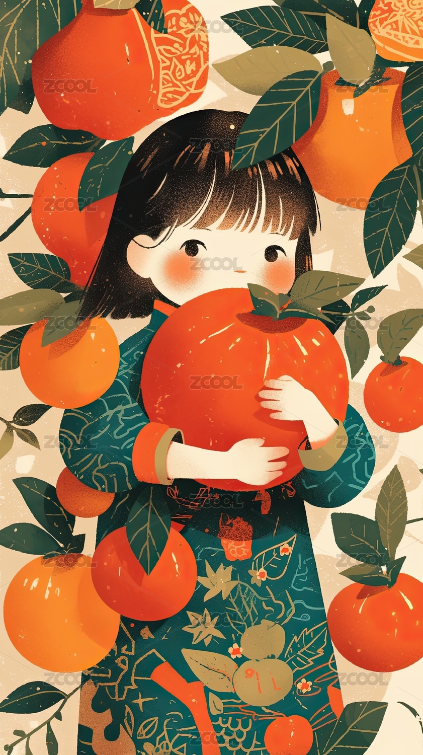 可爱的女孩和桔子插画