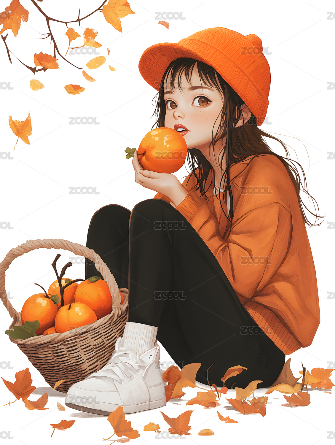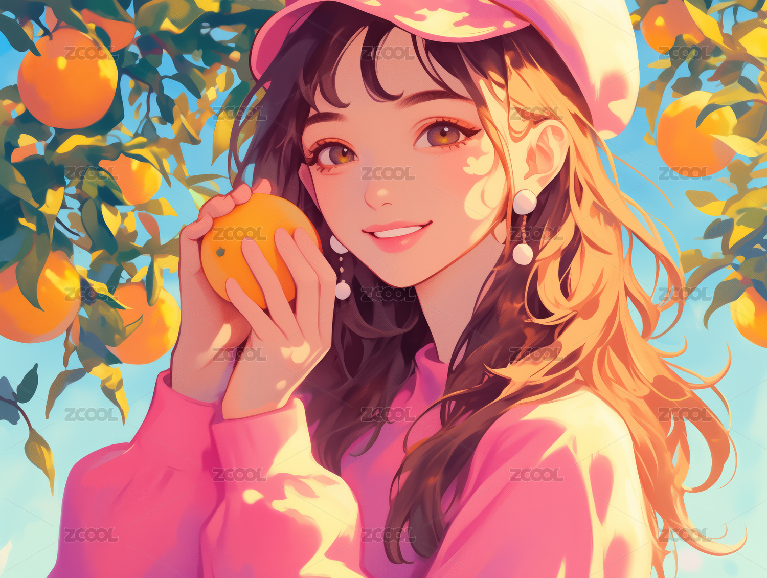 女生户外自然橙子树清新治愈系插画