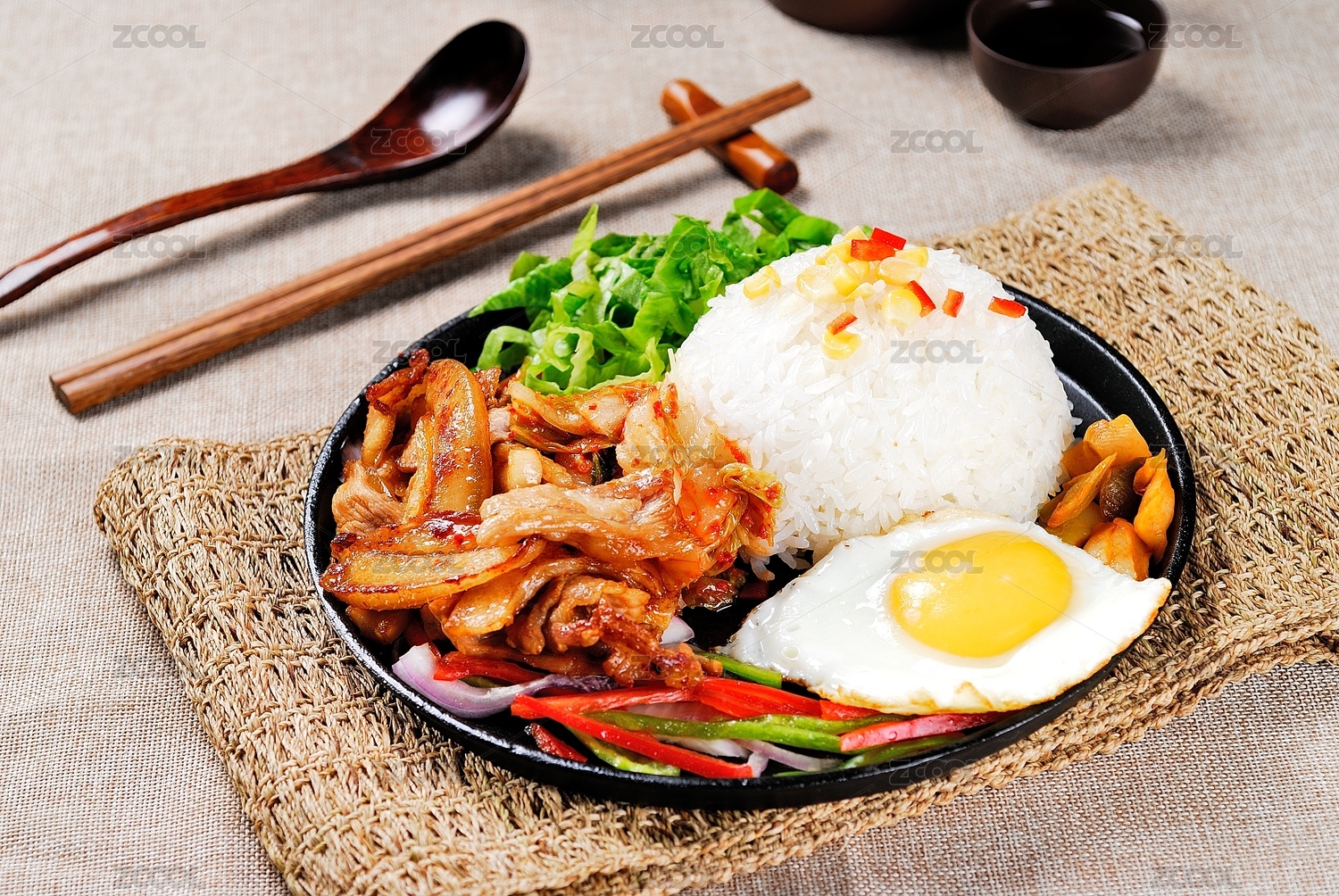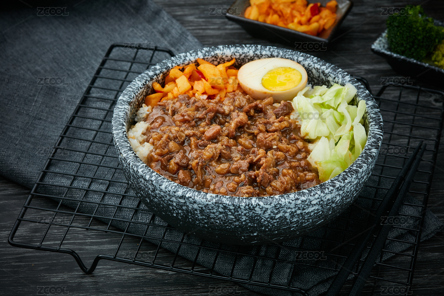 棕色木纹桌面上放着一碗砂锅烤鸡蹄膀拌饭