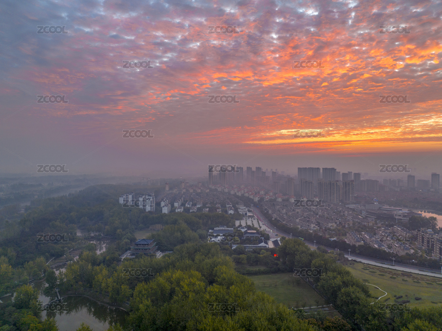 城市风光,蓝天,白云,早霞,朝霞,霞光,建筑,城市,公园,绿化