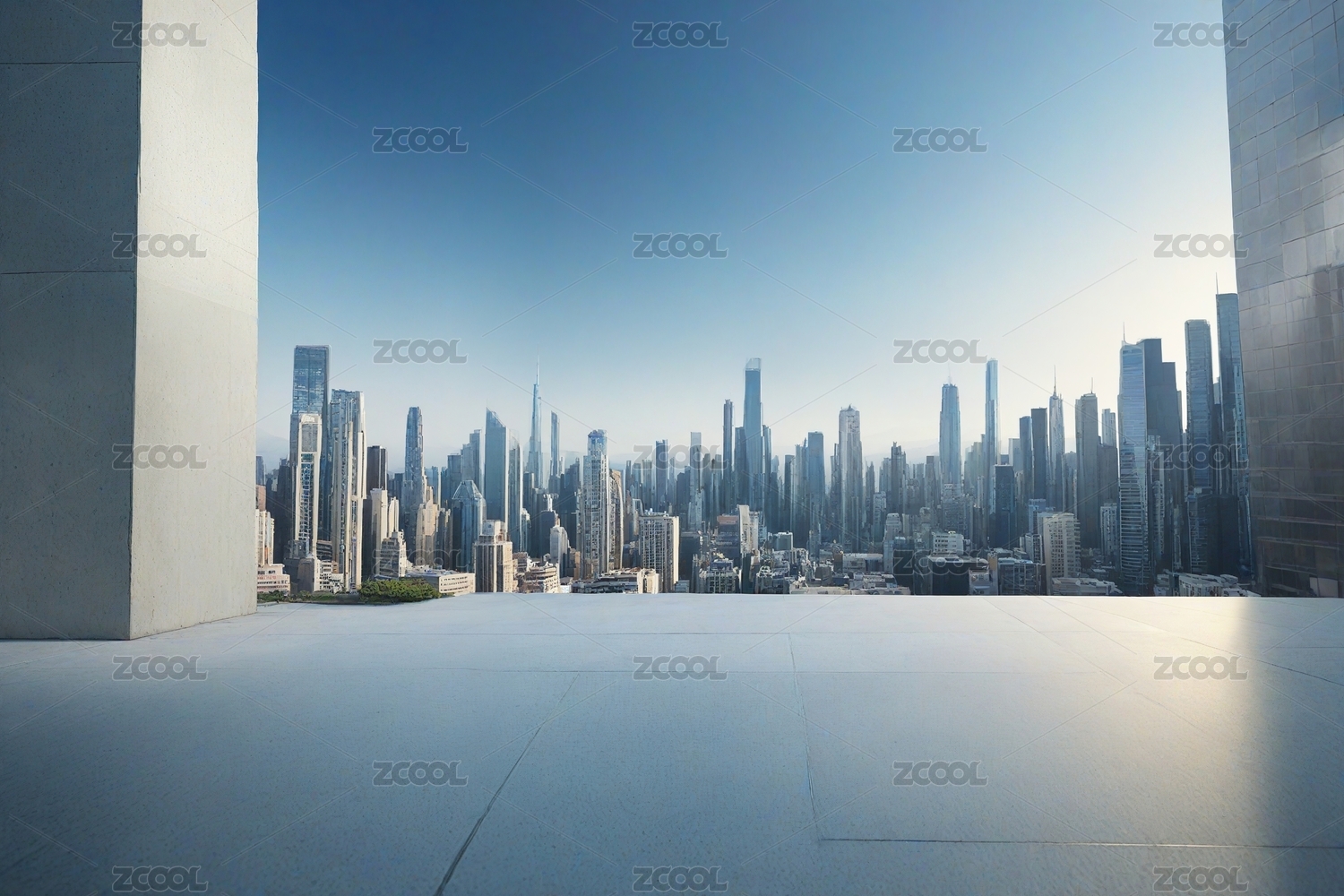 现代建筑与混凝土地面以城市天际线为背景
