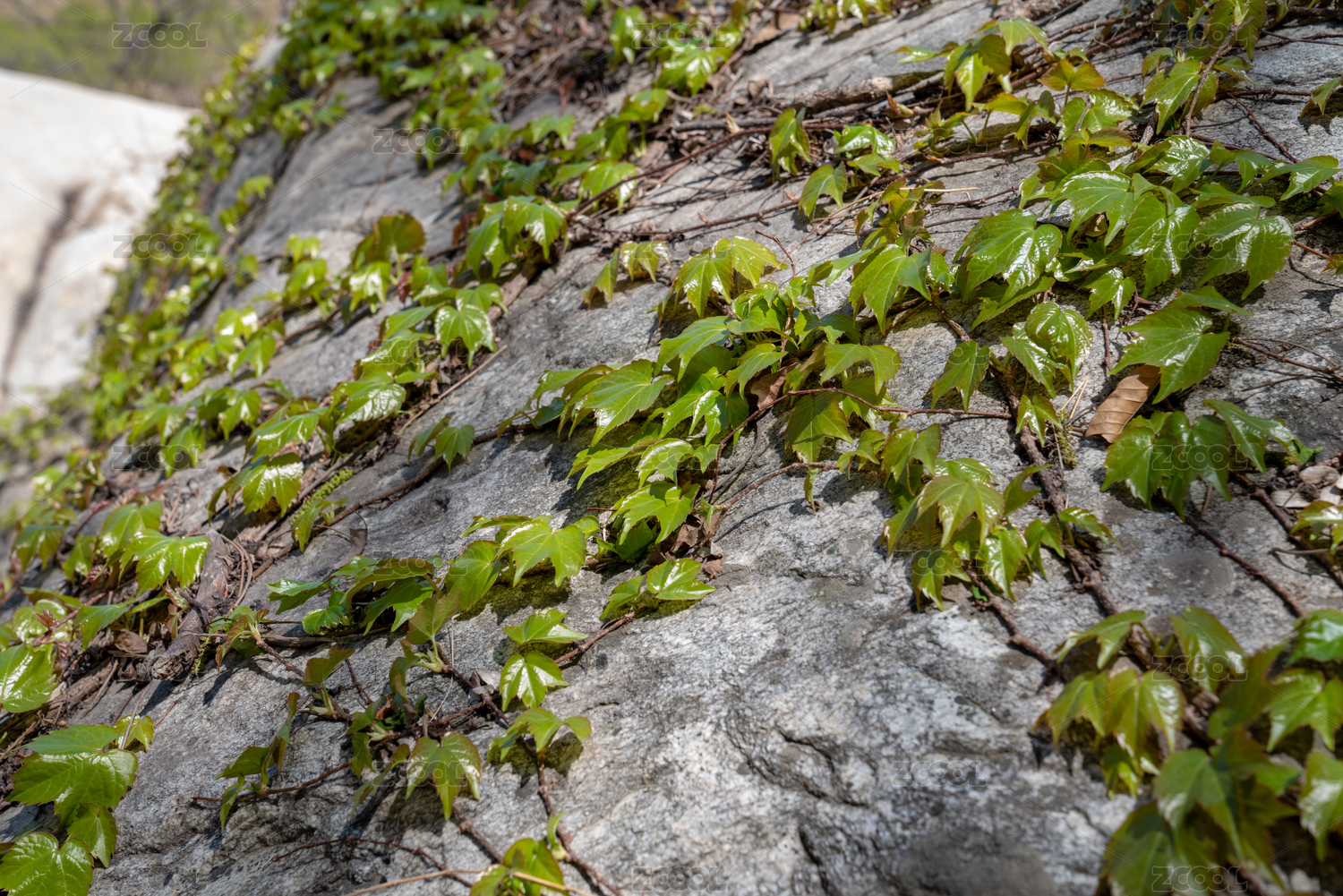 春天岩石上的爬山虎