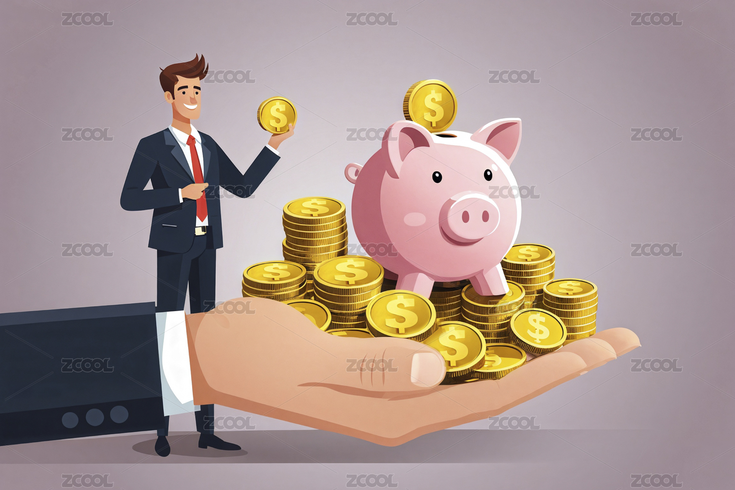 商务男人手捧小猪存钱罐与金币投资理财插画