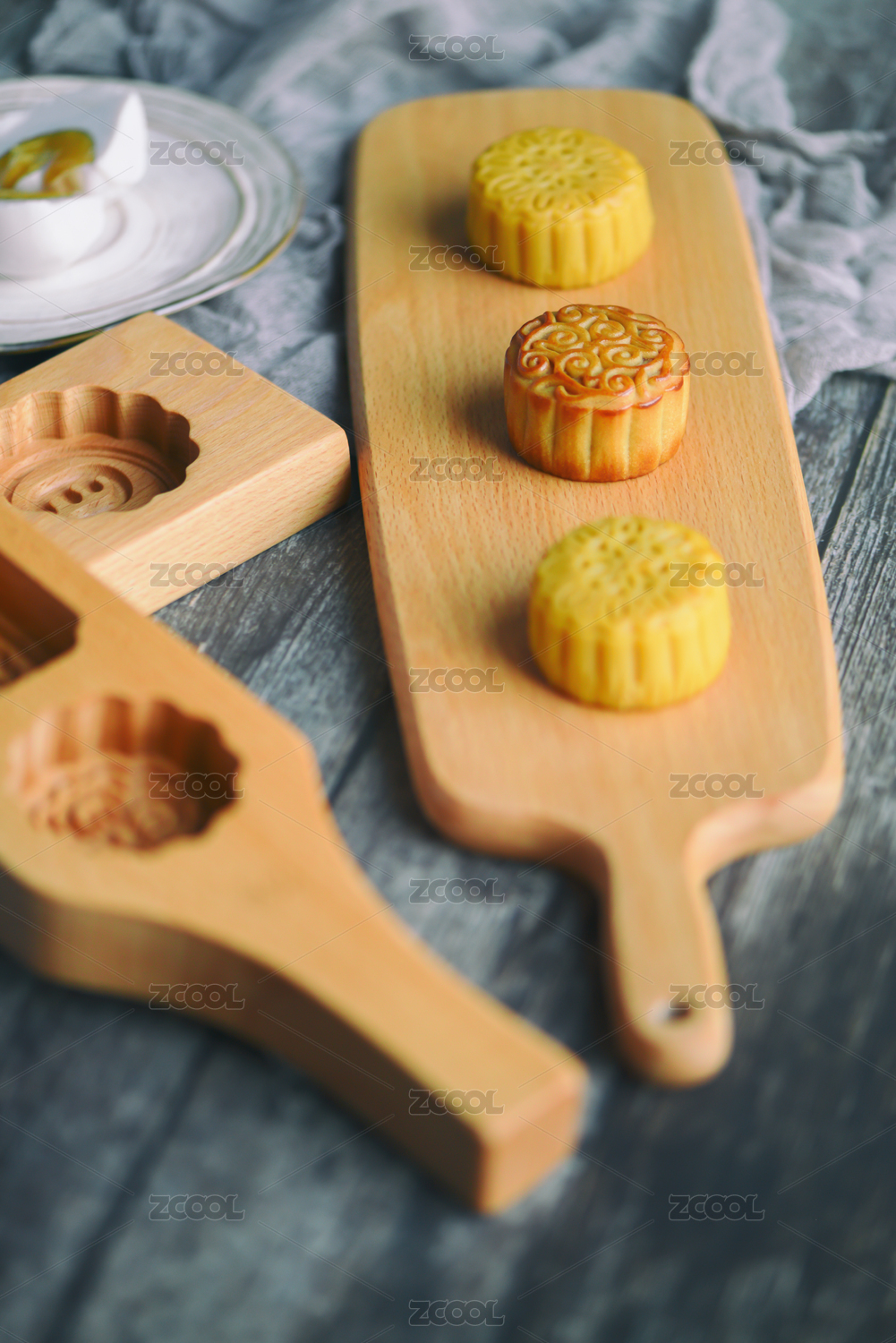 金黄色的可口豆沙馅月饼摆放在木桌上