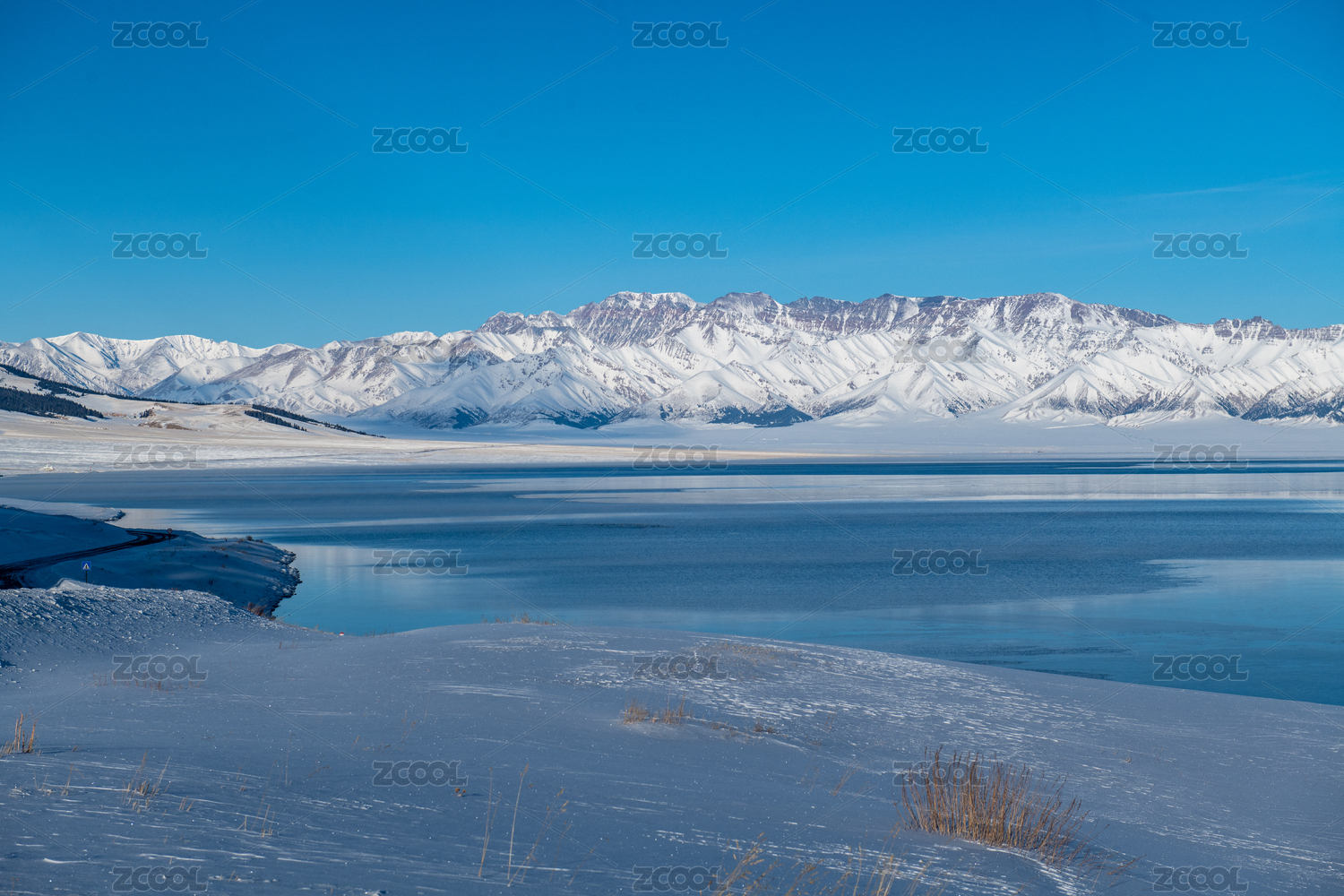 中国新疆伊犁冬季赛里木湖草原的雪景