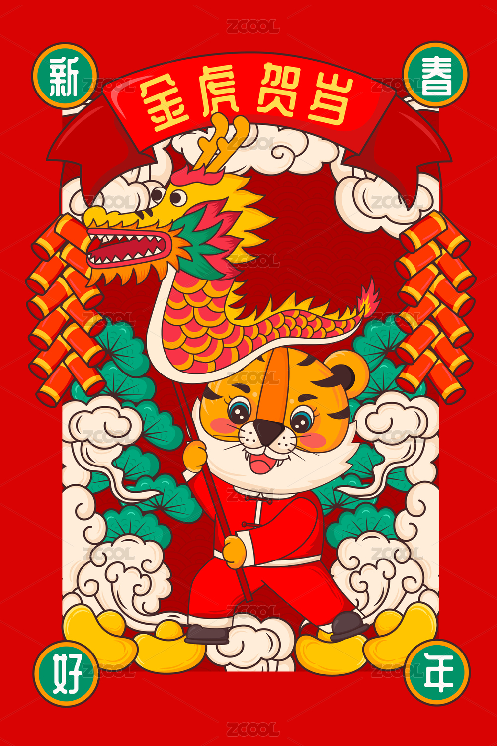 虎年舞龙庆祝春节矢量插画