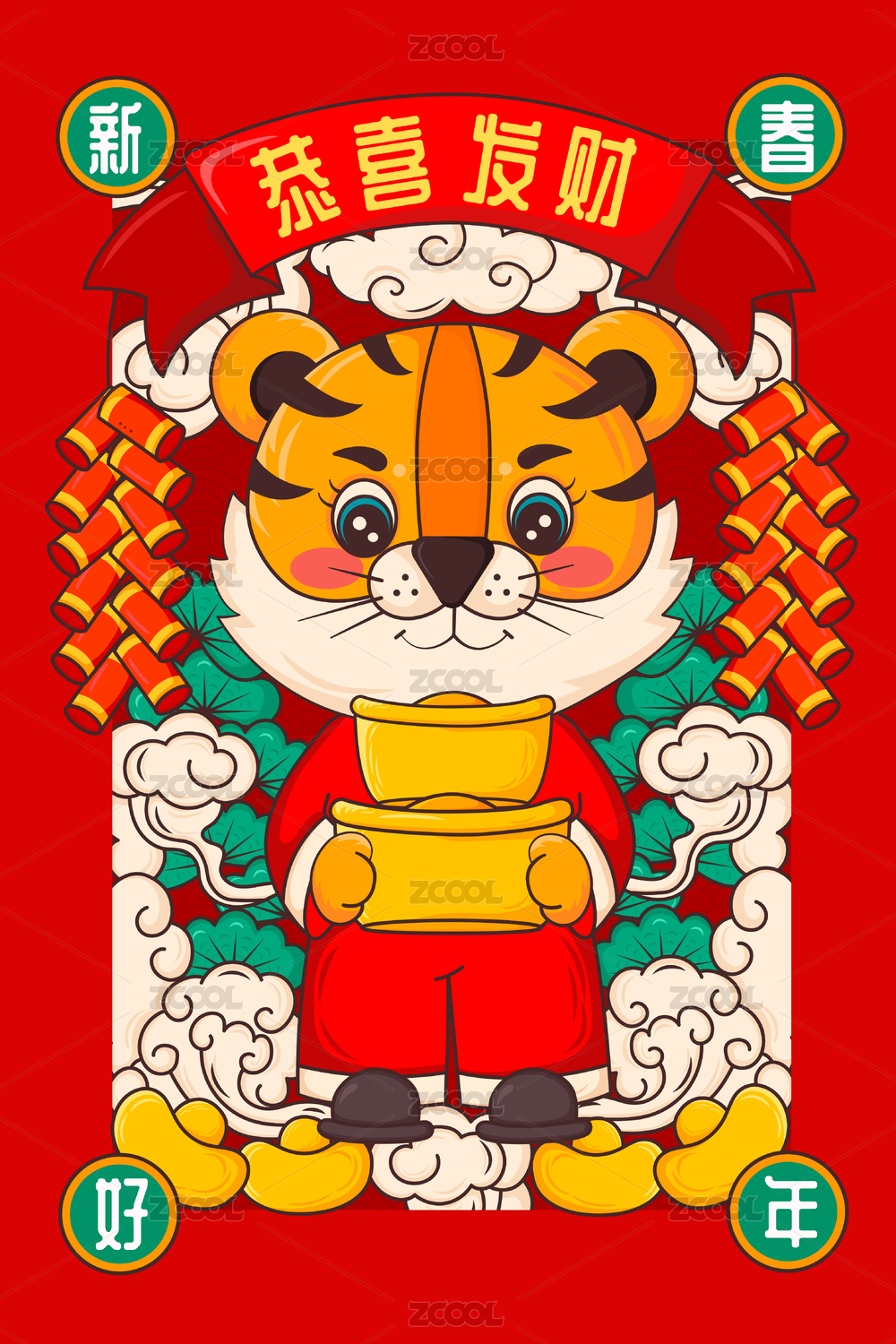 虎年恭喜发财矢量插画