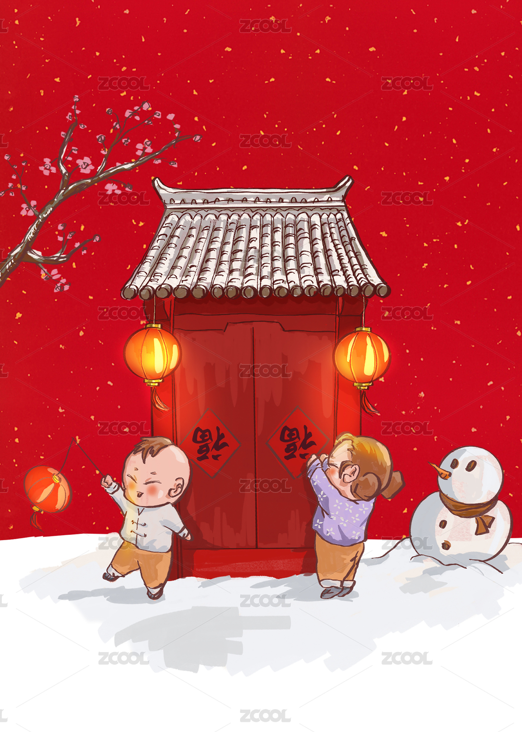 雪地里小朋友们玩花灯和灯笼在迎接春节新年