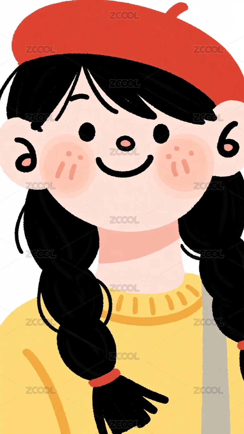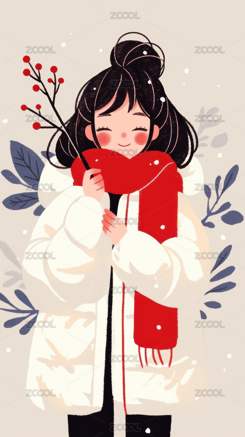 戴着帽子围巾抱着宠物狗的少女 手绘插画