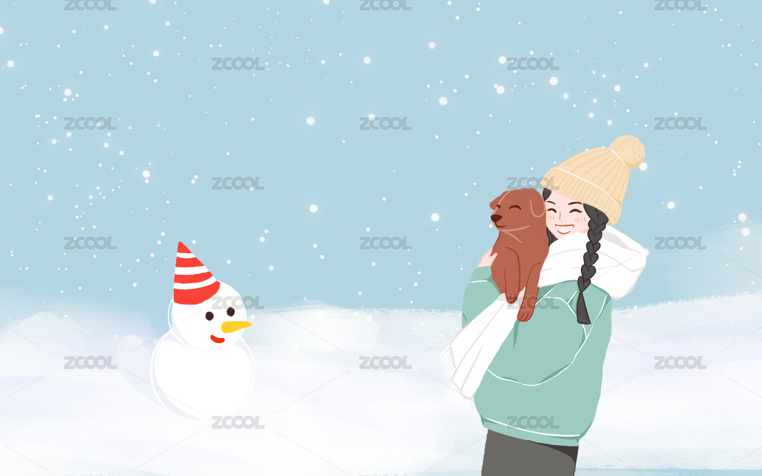 少女抱着宠物狗在雪地上玩耍 手绘插画