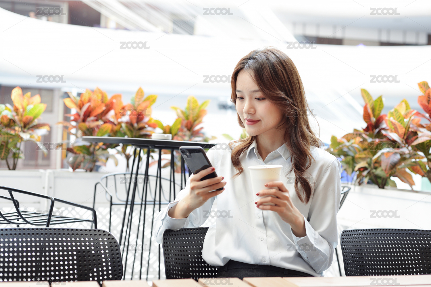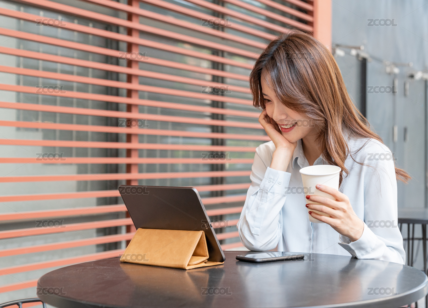 一个中国年轻女白领坐在室外咖啡厅用平板电脑