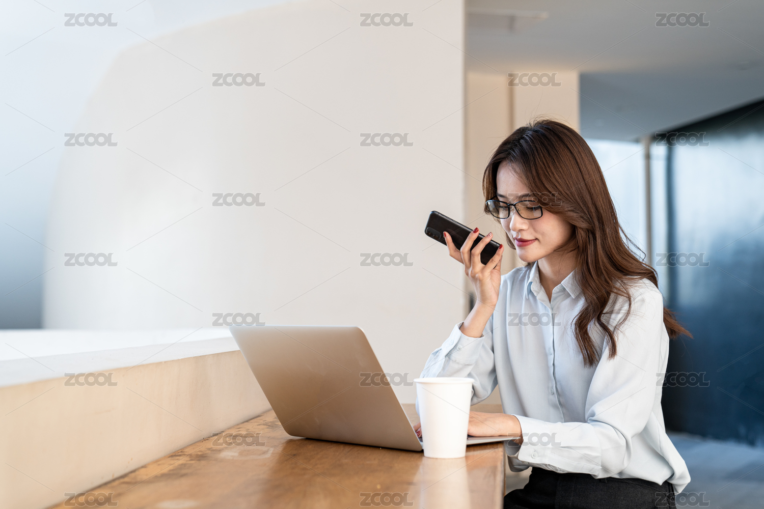 一名年轻的商务女性坐在电脑前使用手机发语音