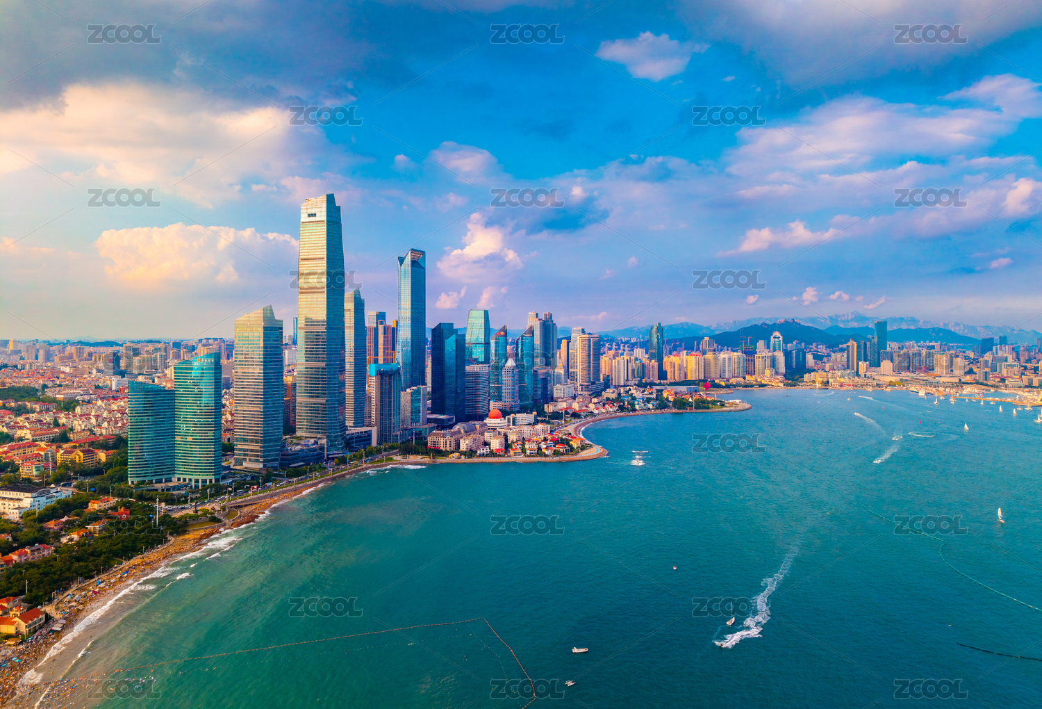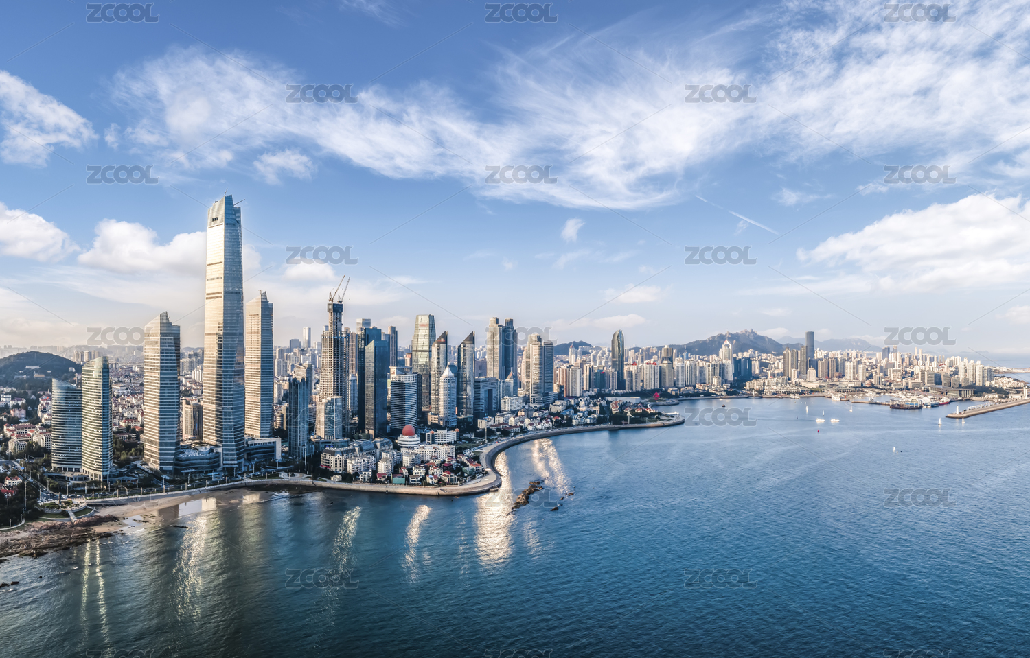航拍中国山东青岛东部新城金融区建筑景观天际线