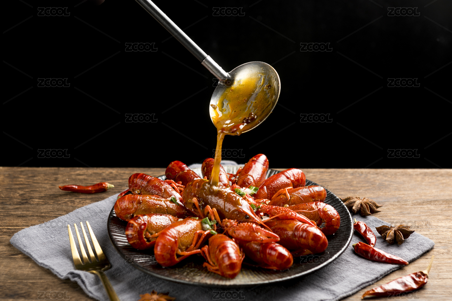 白底上摆放的一盘码放整齐麻辣小龙虾