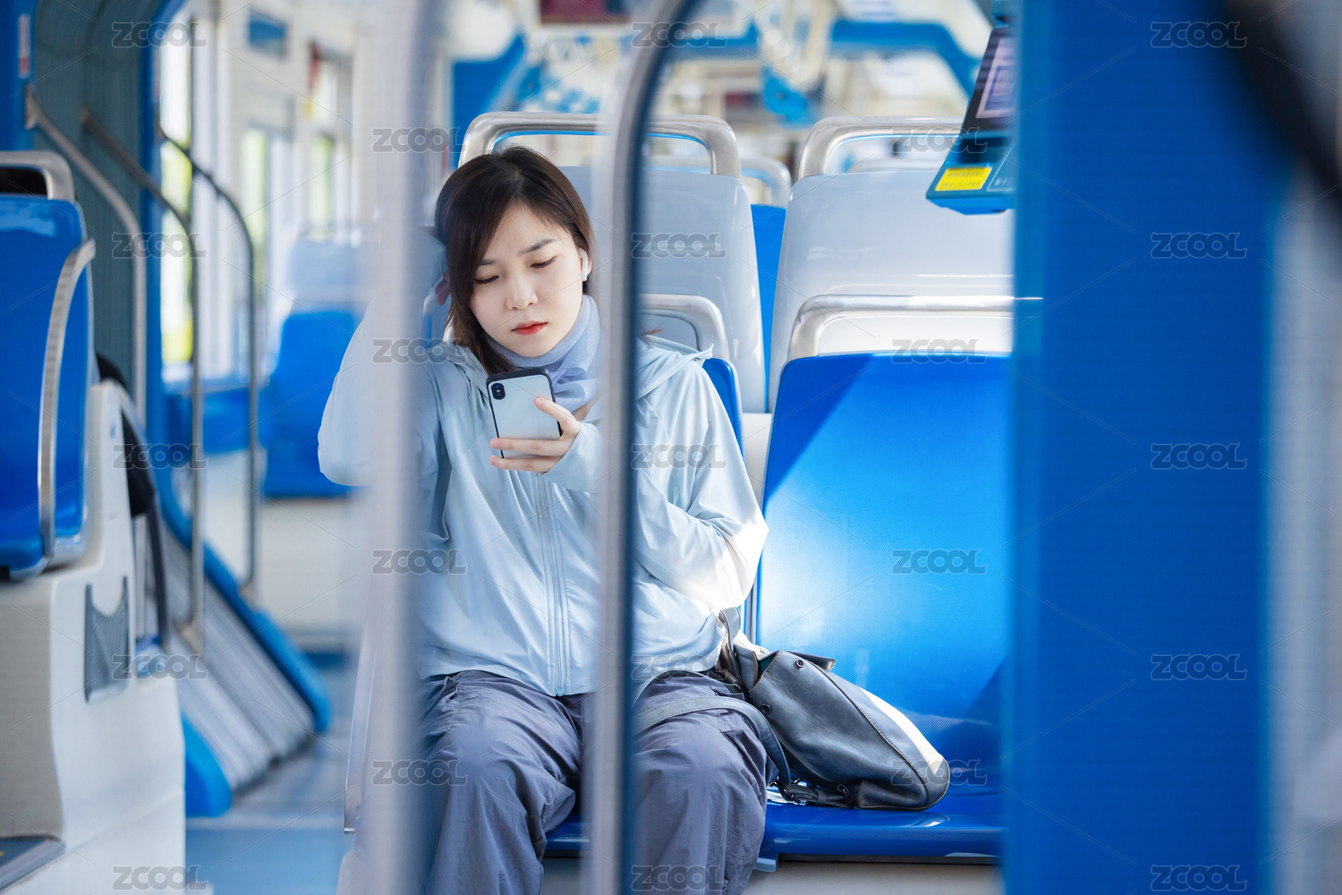 通勤,公交车,室内,女性,使用,智能手机,城市,交通,生活方式,等待