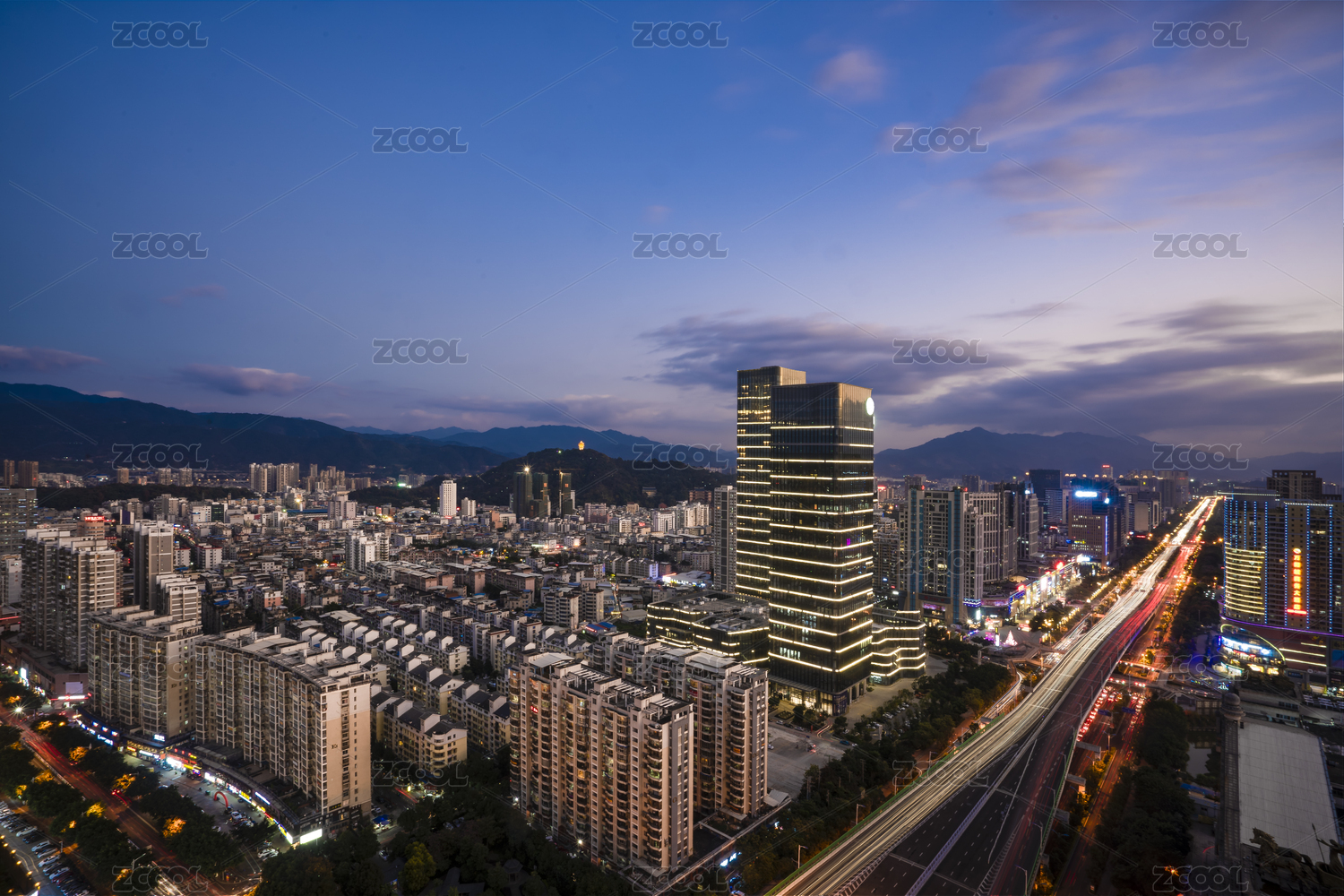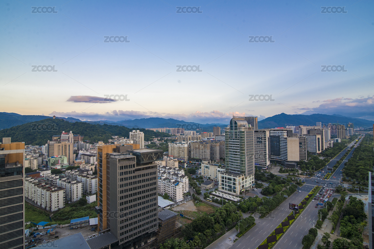 日落时分龙岩大道及两边的建筑,中国福建龙岩