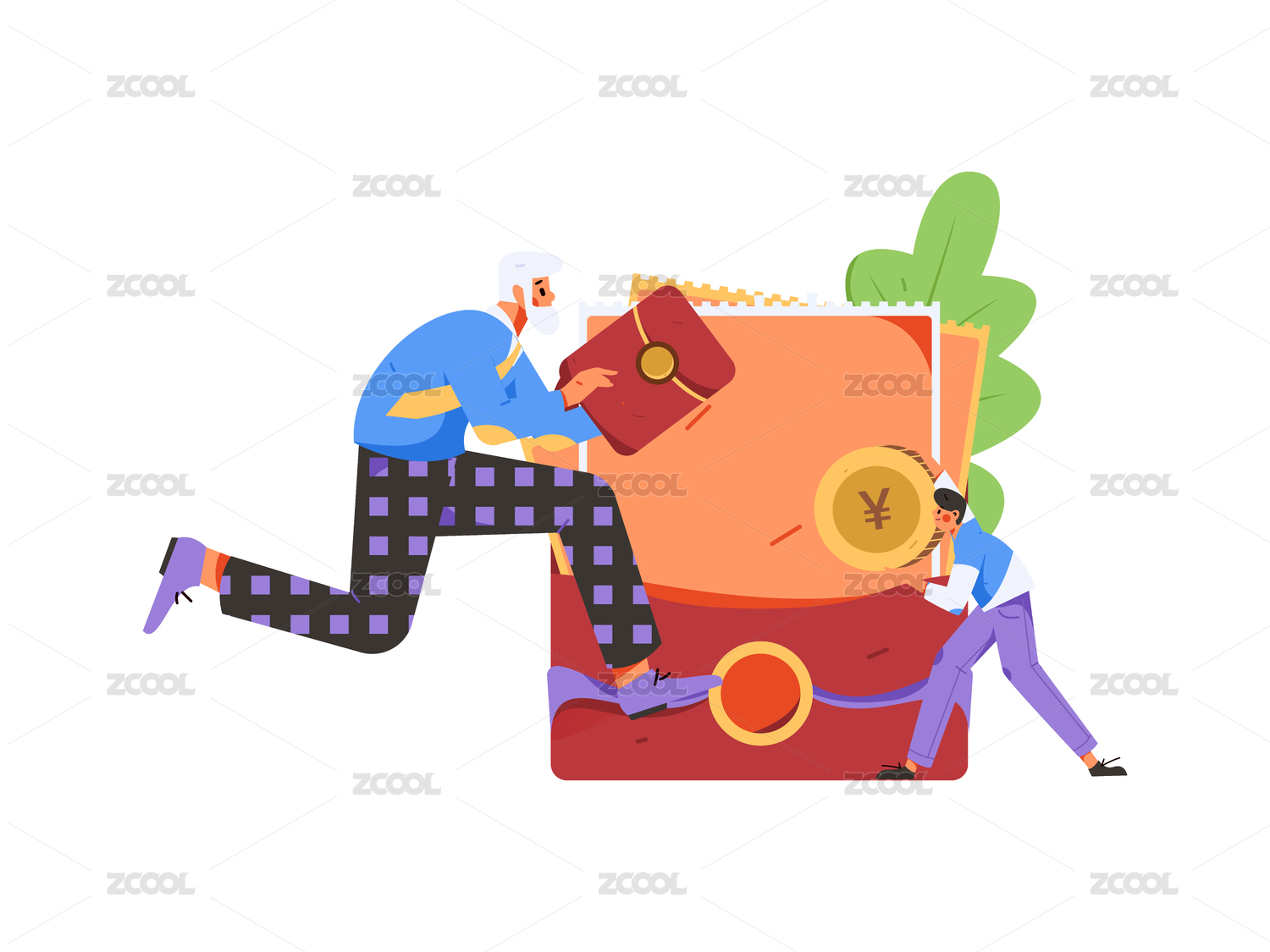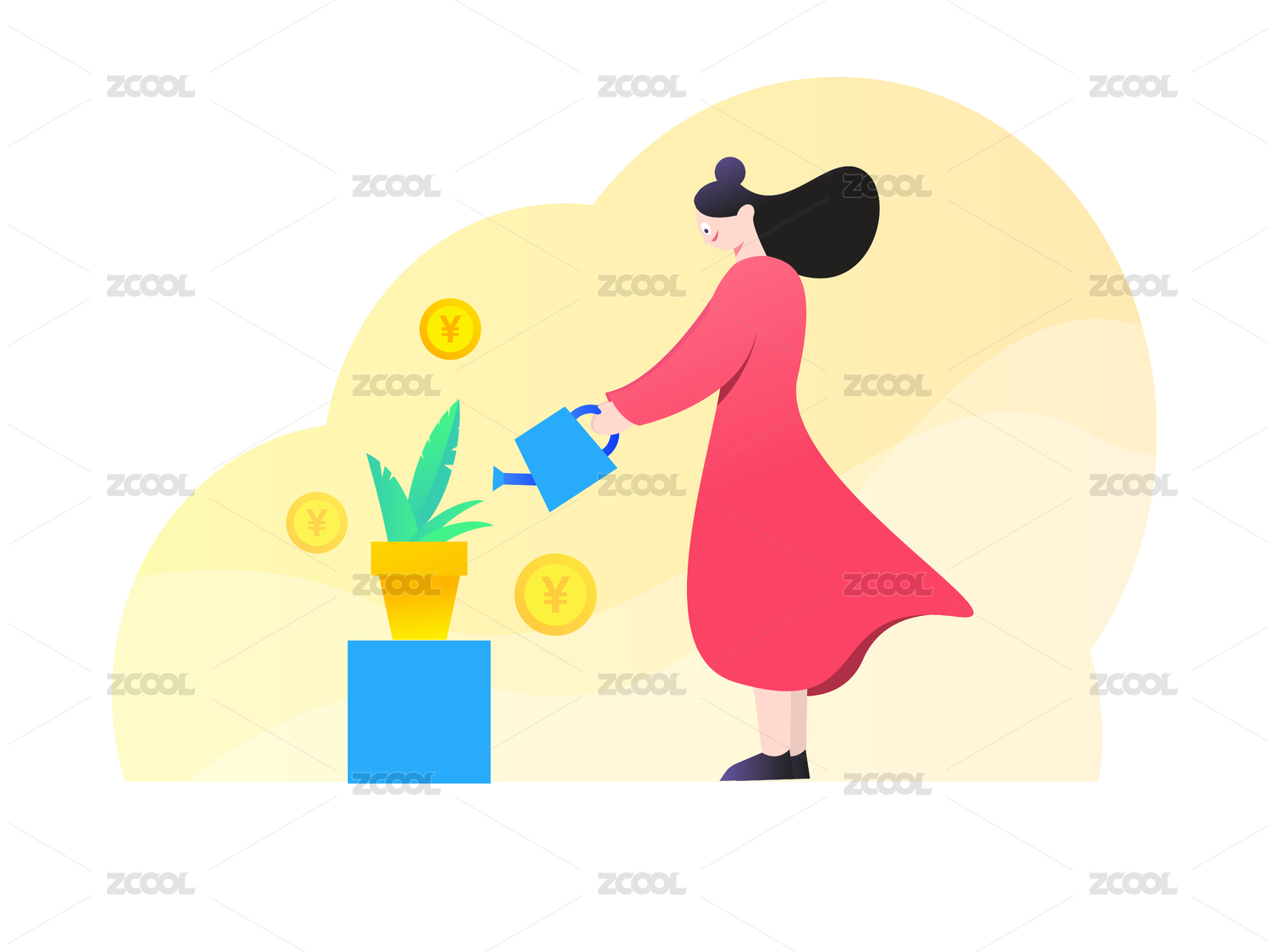 农夫洒水浇持续签到灌金钱树苗获得钱币扁平插画