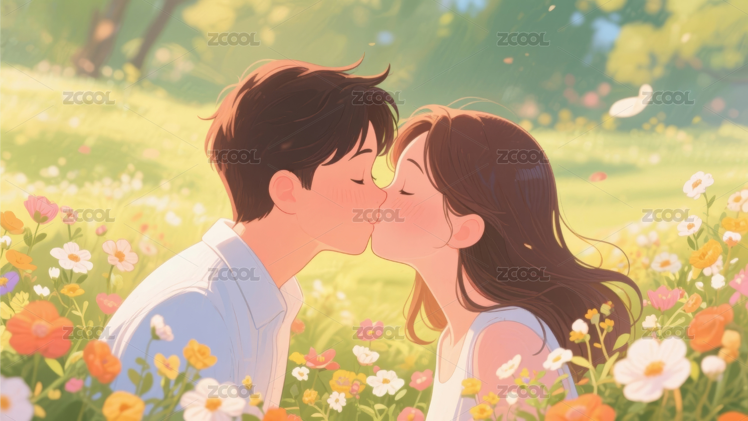 浪漫情侣的甜蜜对视心动瞬间的唯美定格插画