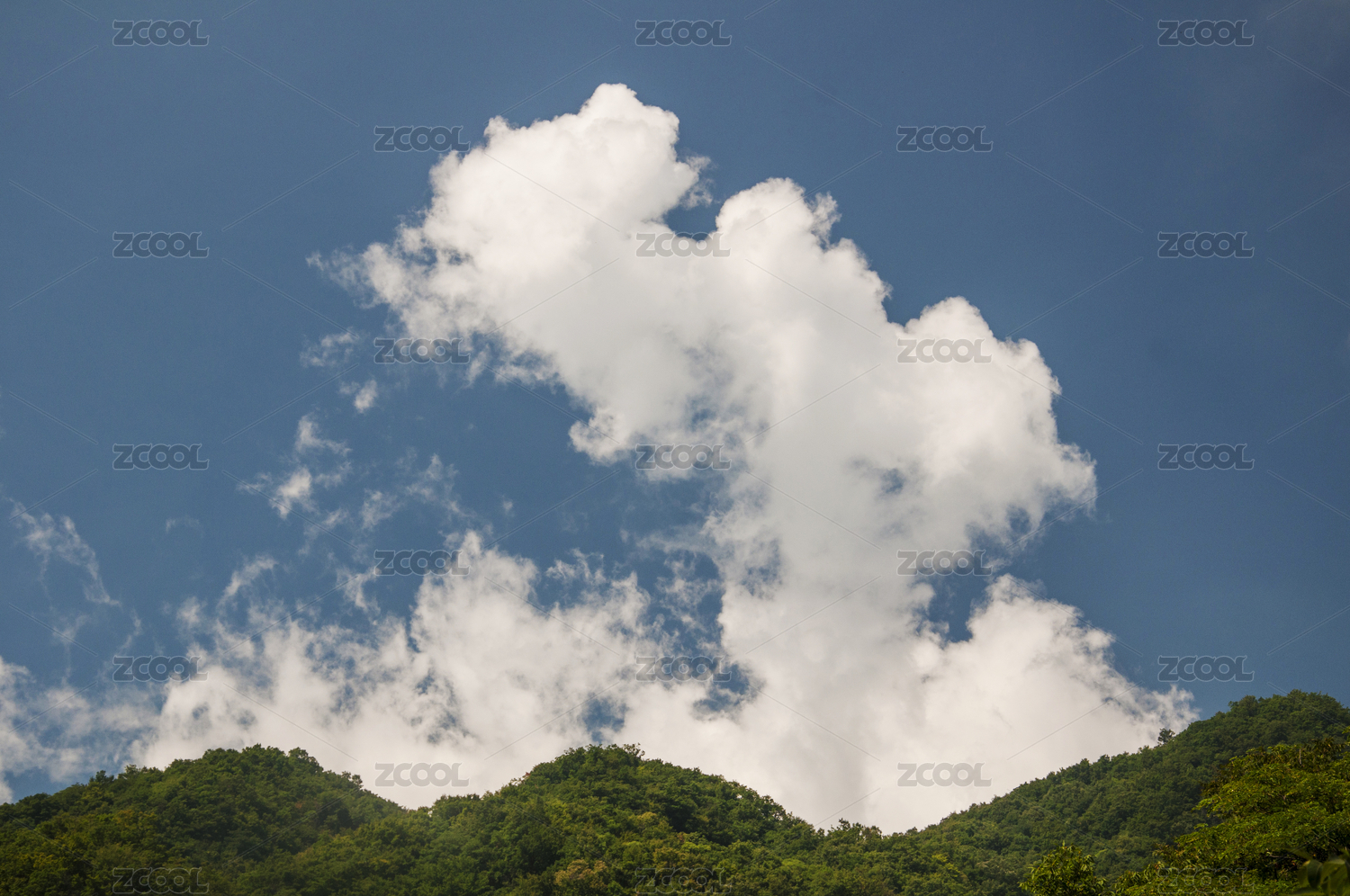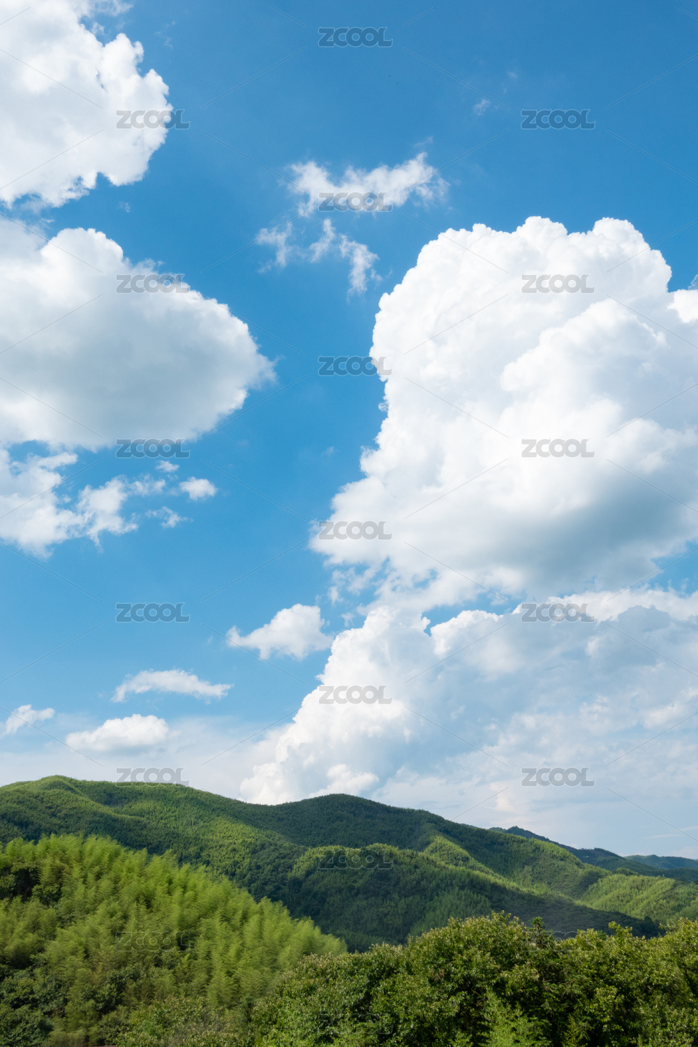 蓝天白云下的绿色山脉